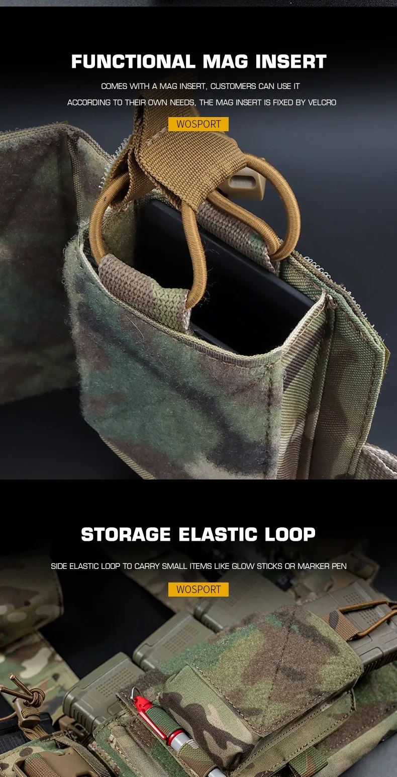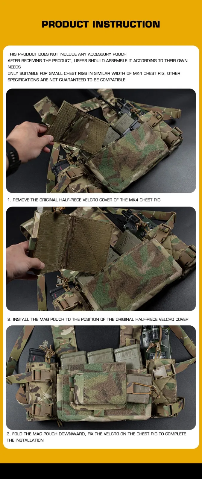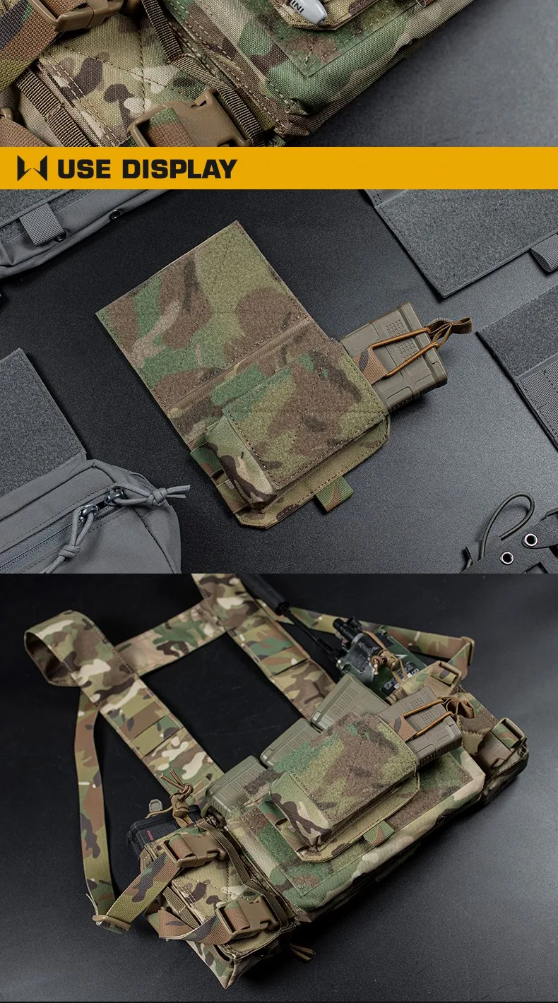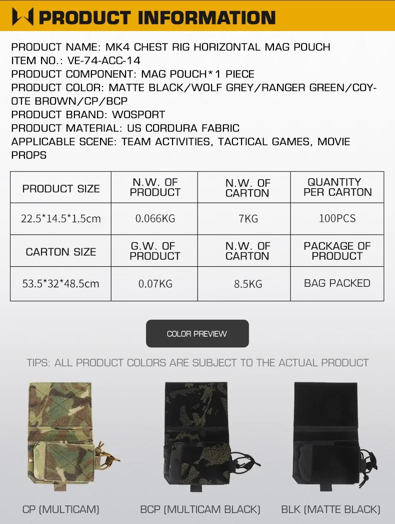 Nombre del producto: bolsa magnética Horizontal MK4 Chest Rig N. ° de artículo: VE-74-ACC-14 Embalaje del producto: bolsa embalada Tamaño del producto: 22,5x14,5x1,5 cm Peso neto del producto: 0.066KG Peso bruto del producto: 0,07 KG Color del producto: negro mate/gris Lobo/Verde Ranger/Marrón Coyote/Multicam negro Escena aplicable: actividades de equipo, juegos tácticos, accesorios de películas Material principal: tela Cordura El paquete incluye: 1 * bolsa magnética