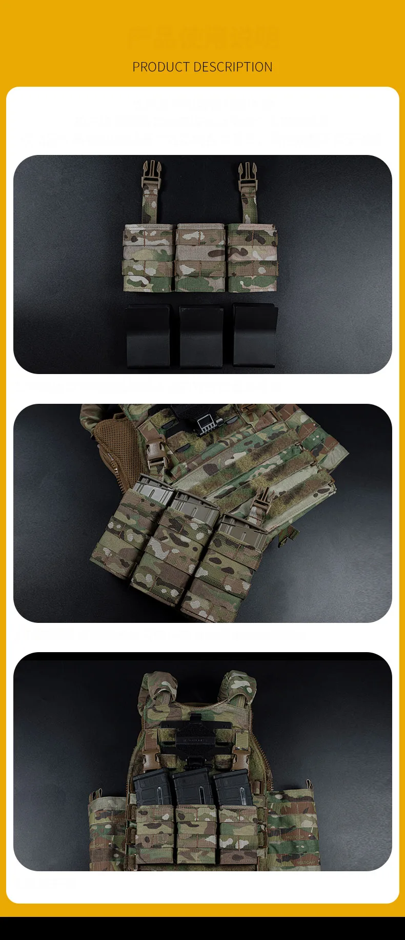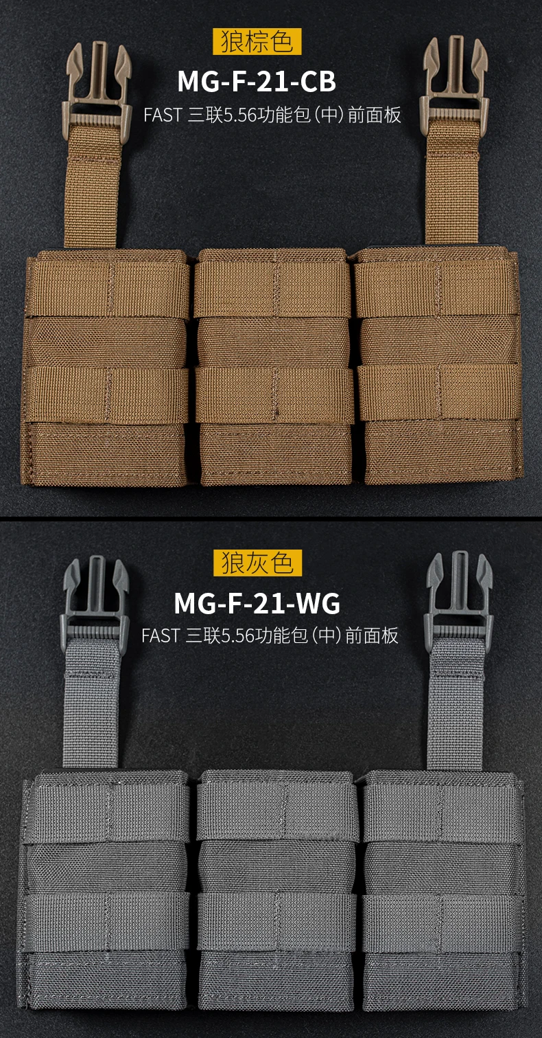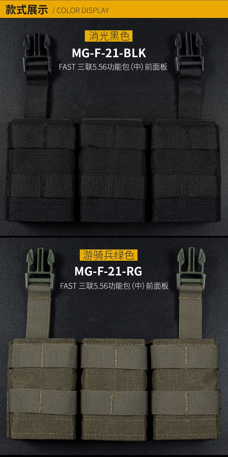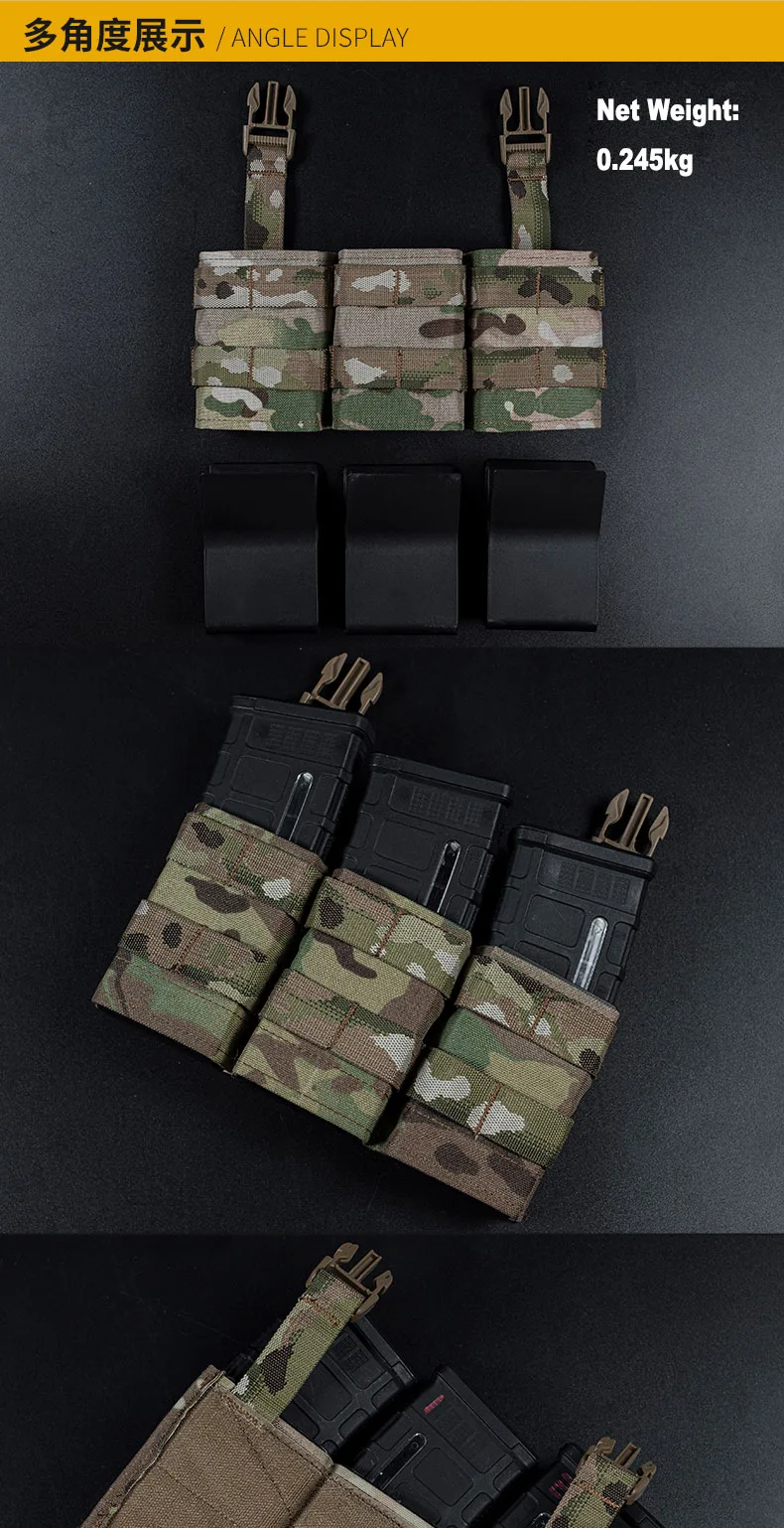 Nombre del producto: rápido 7,62/5,56 mmTriple bolsa Mag (medio) Panel frontal Artículo No.:MG-F-21/23 Embalaje del producto: bolsa embalada Tamaño del producto: 10x4,5x13,5 cm Peso neto del producto: 0.134KG Peso bruto del producto: 0,15 KG Material principal: tela mate/tela CORDURA