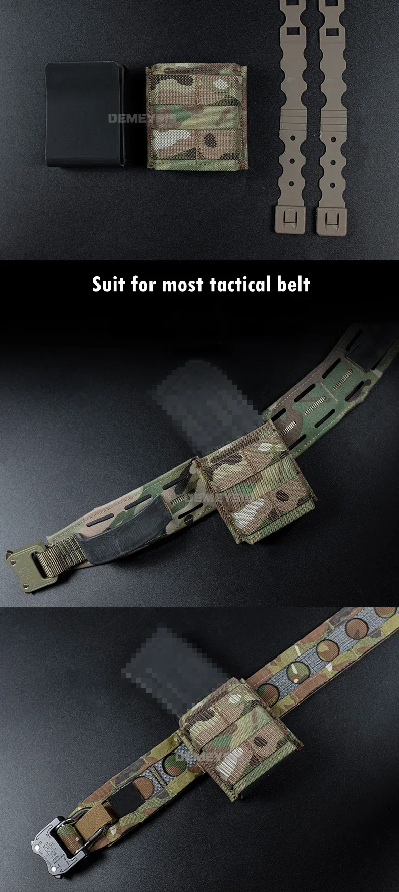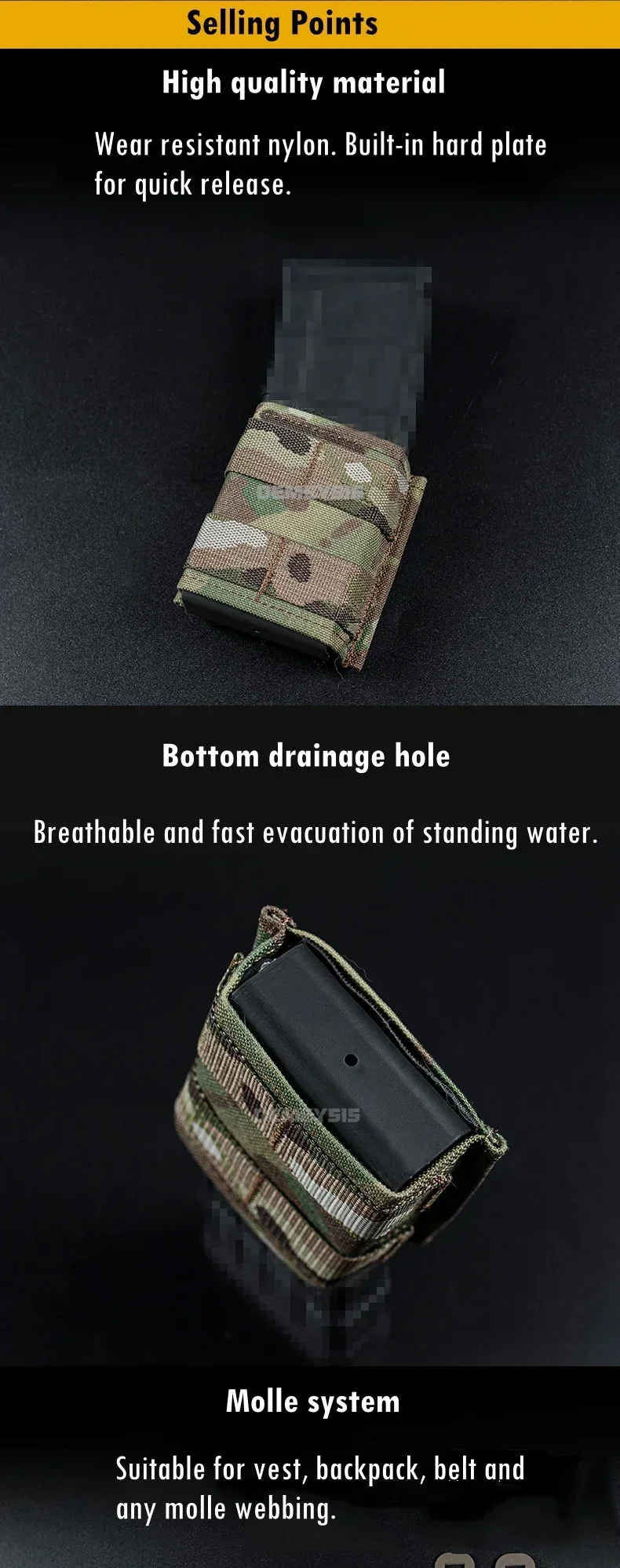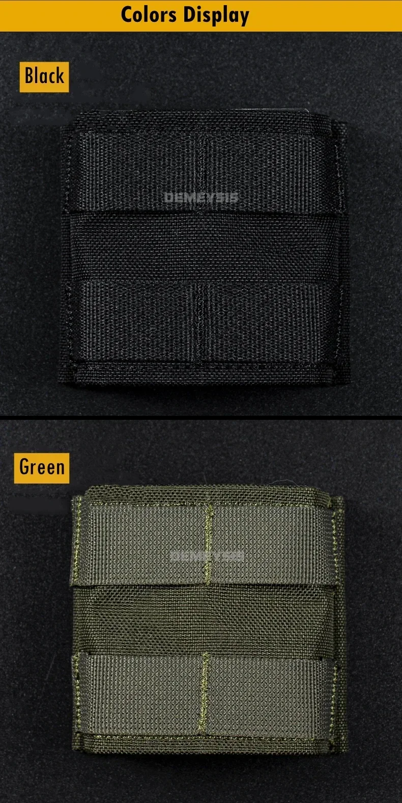 ● El sistema MOLLE en la parte posterior garantiza que la bolsa sea compatible con cualquier MOLLEEquipo, capaz de ser montado en un cinturón táctico, mochila, chaleco táctico o cualquier otro sistema MOLLE.