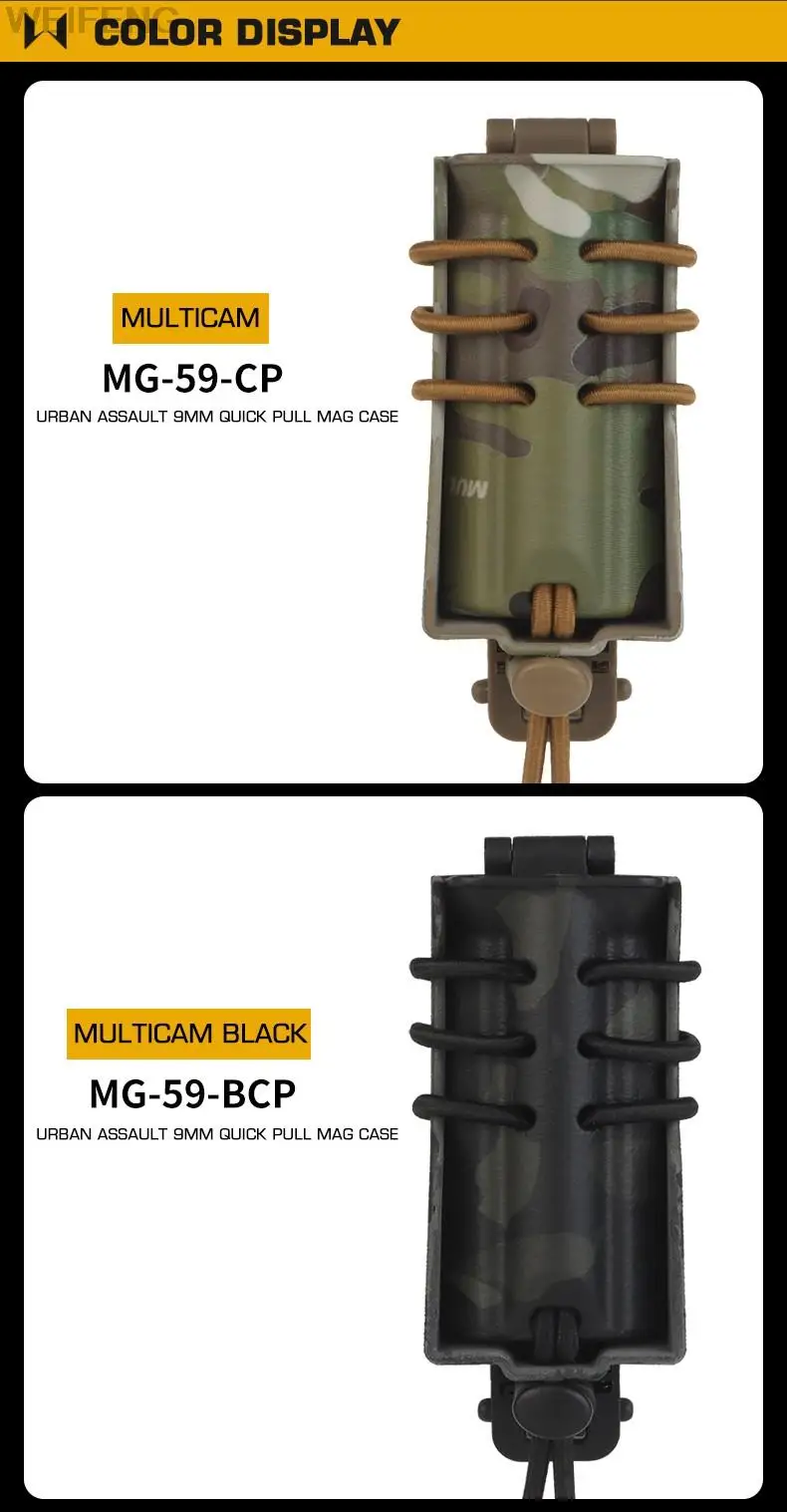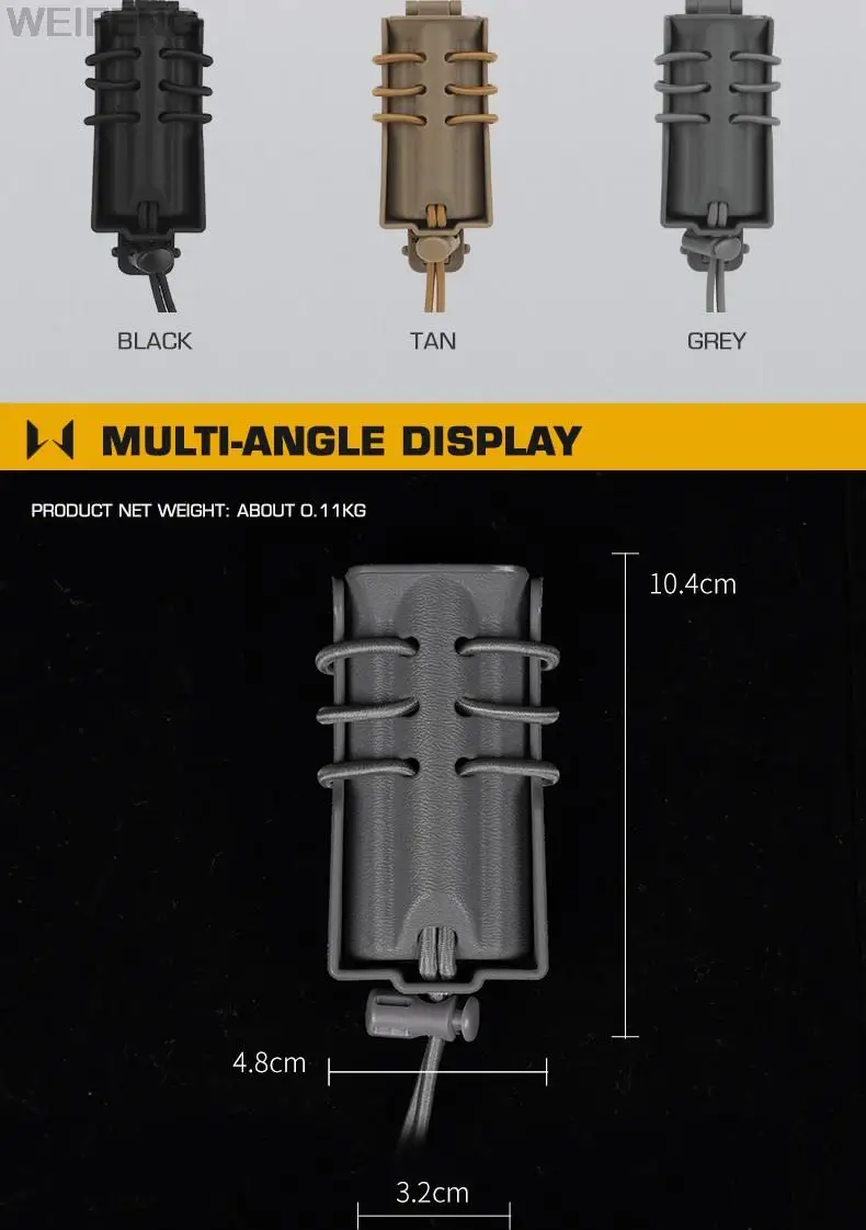 Urban Assault 9mm Quick Pull Mag Color de la Caja: negro, verde, marrón, gris, CP,BCP Tamaño: 14*11*5,3 cm Peso: 110g Material:nylon + tela elástica Material de nylon de alta calidad, duradero y usable, largo tiempo de uso; Sistema Molle, para la mayoría de los modelos chaleco, cinturón, mochila o bolso; Tela elástica, para la mayoría de los accesorios, como bolígrafo, linterna, tijeras, bolígrafo; Perfecto para deportes al aire libre, caza, actividades de CS; Lista del paquete: Bolsa de 1x1 ".