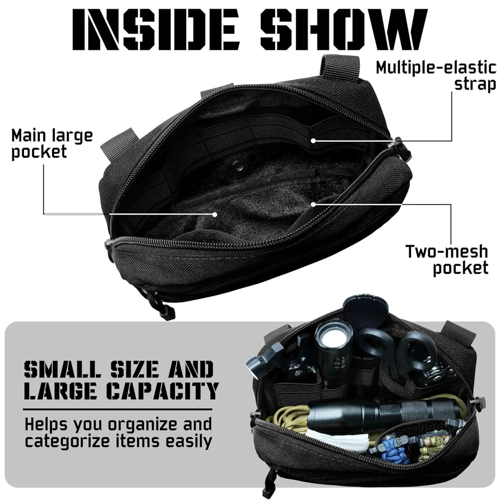 La bolsa para herramientas Molle es liviana y portátil, y puede llevarla consigo a cualquier lugar, en su bicicleta, en su automóvil o agregarla al chaleco de su perro de servicio.Se puede utilizar como bolsa para chaleco, bolsa para mochila, bolsa para cinturón, bolsa para volcar, bolsa EMT, bolsa subabdominal, bolsa para herramientas, etc., según sus necesidades.
