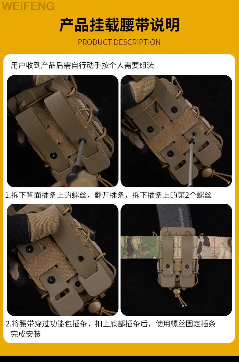Nombre: Bolsa de revista táctica molle de 5,56mm y 9mm Color: negro, verde, tostado, gris Peso: 200g Material:nylon Material de nylon de alta calidad, duradero y portátil, largo tiempo de uso; sistema Molle, para la mayoría de los modelos, chaleco, cinturón, mochila o bolsa; Perfecto para deportes al aire libre, caza, actividades CS; Lista del paquete: 1 x bolsa para revista.