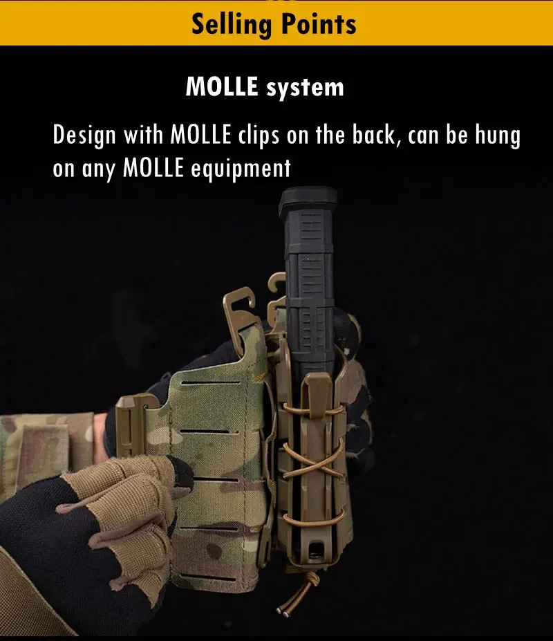 ●Sistema MOLLE. Diseño con clips MOLLE en la parte posterior, se puede colgar en cualquier equipo MOLLE.