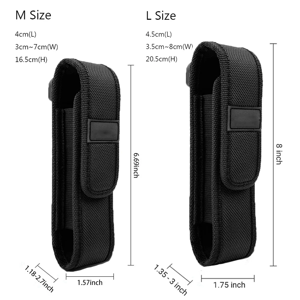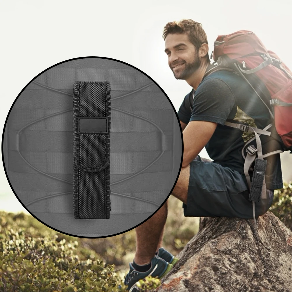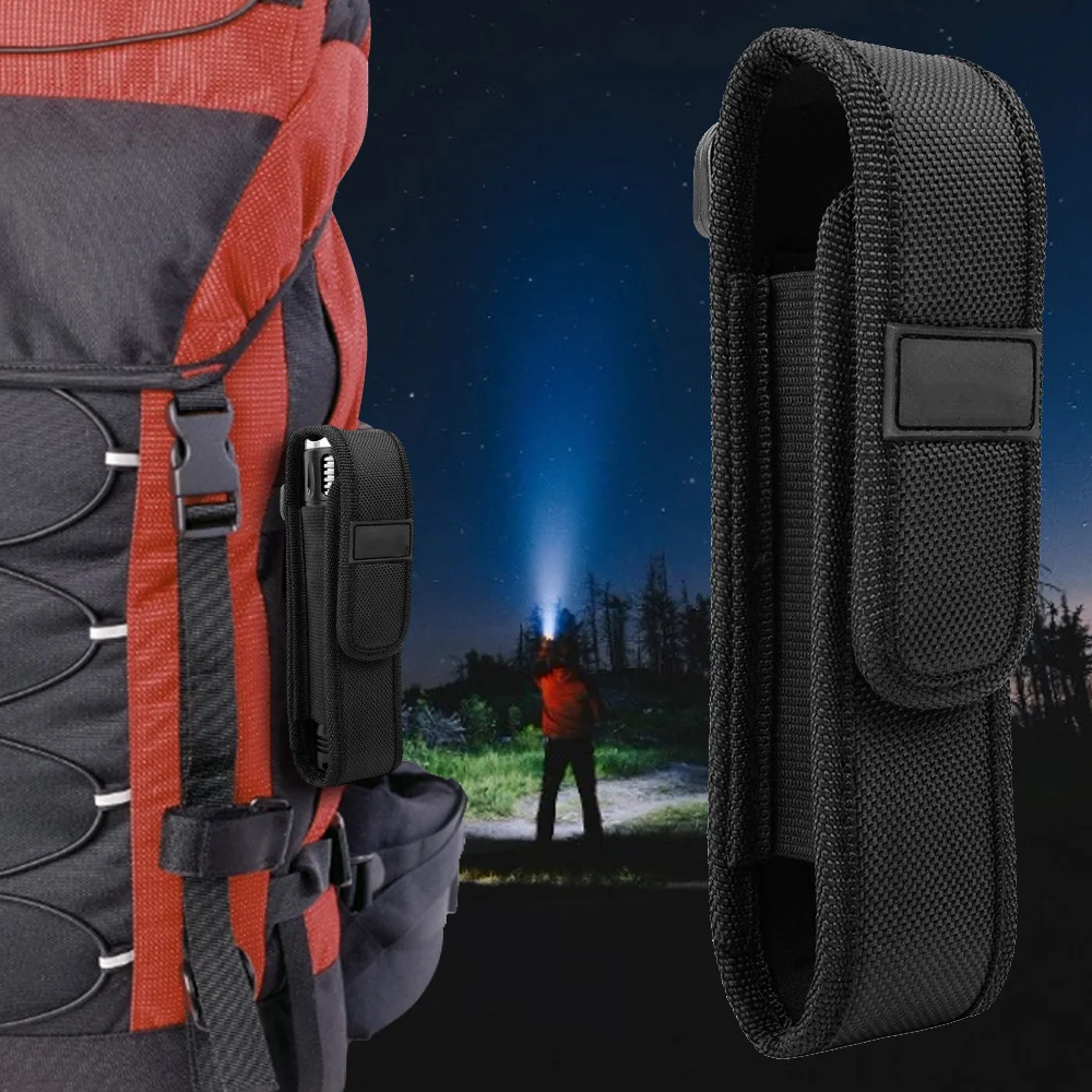 3. Sistema Molle: funda de transporte para linterna con cierres de velcro y botón a presión en la parte posterior, se puede sujetar a un cinturón o engranajes MOLLE.
