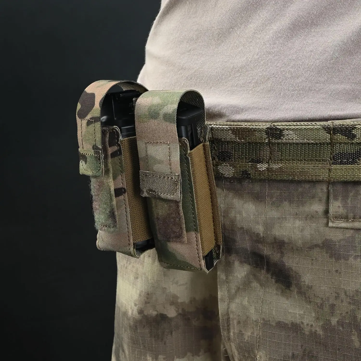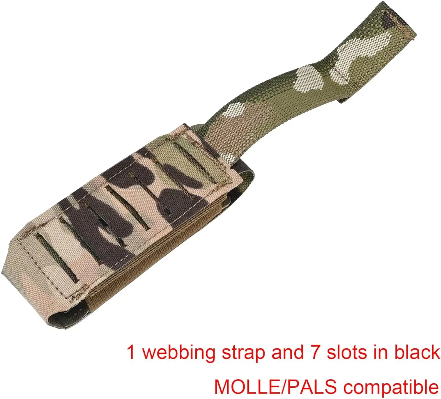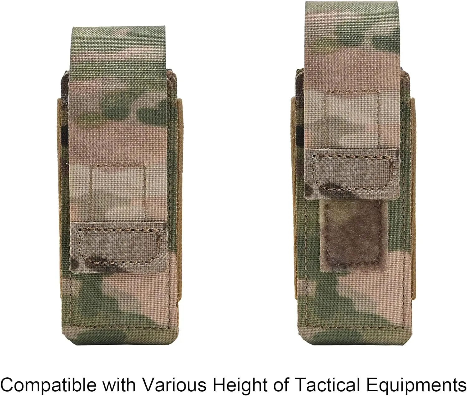 ② La bolsa MOLLE tiene tela elástica en ambos lados: La tela elástica puede adaptarse a cualquier forma del contenido y fijarse en su lugar. La funda de spray de pimienta MOLLE se puede usar no solo como soporte de spray OC sino también como bolsa de Granada de aturdimiento M84, bolsa de flashbang, soporte de radio táctico de mano pequeña y bolsa de revista de 9mm.