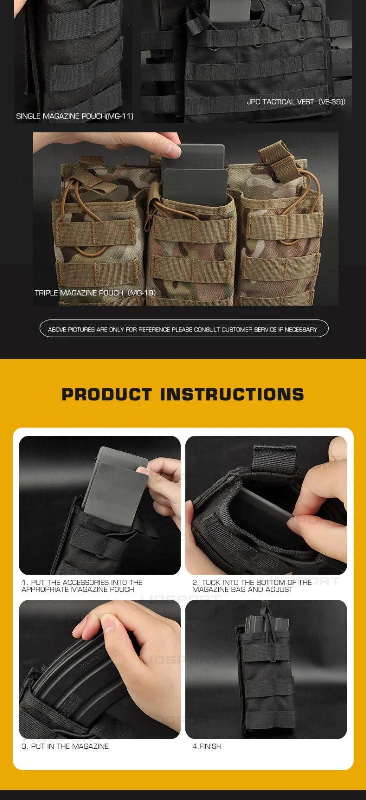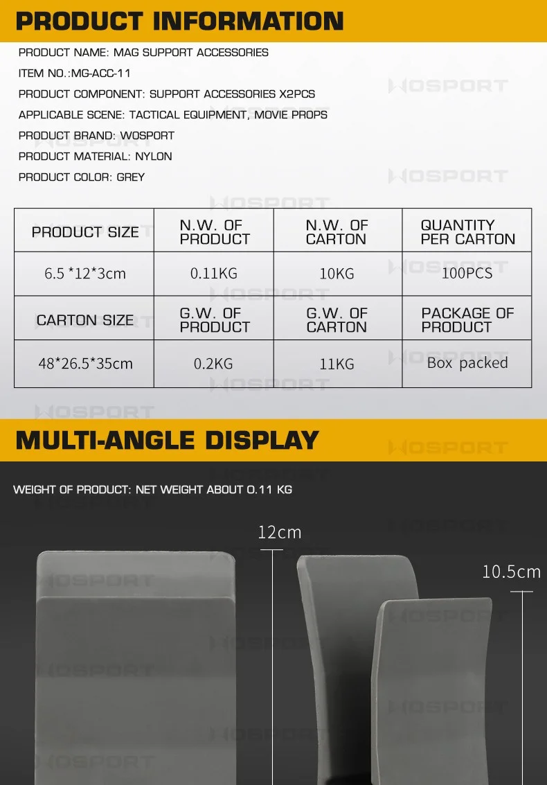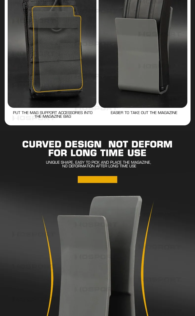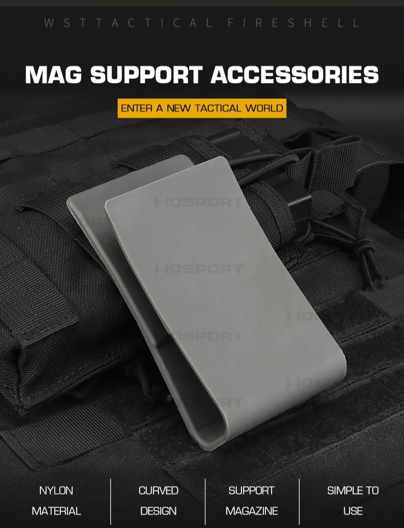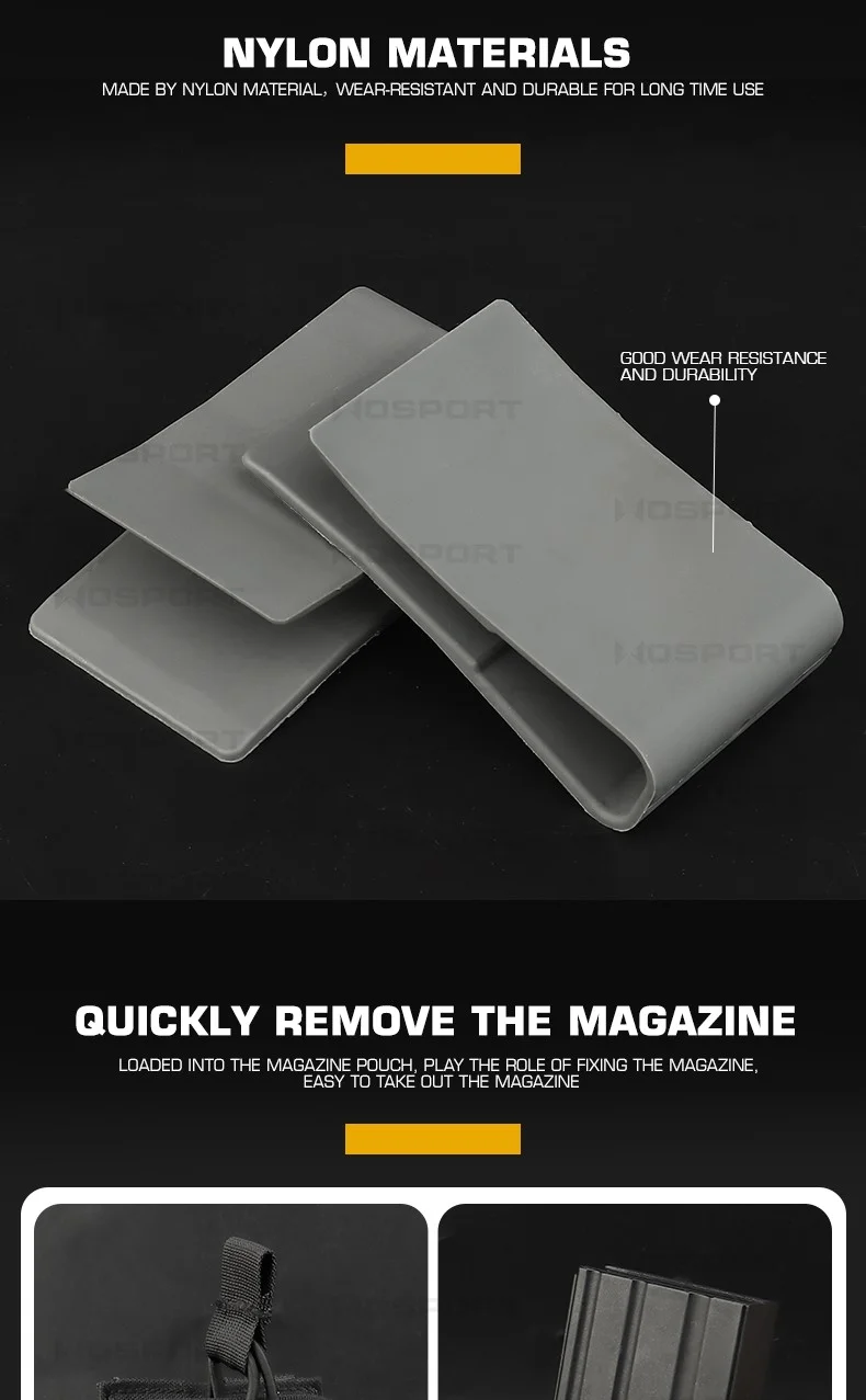 Características:Fabricado con material de fibra de nailon, duradero y de alta resistencia. Tamaño: 6,5*3*12cm Compatible con revistas 5.56, 5.45, 7.62 y.308 Diseño de clic para dibujar e insertar rápidamente Funciona con bolsillos superiores abiertos de nailon, sin elásticos y sin sacrificar la retención del cargador. Adecuado para: tiro, caza, deportes de airsoft.