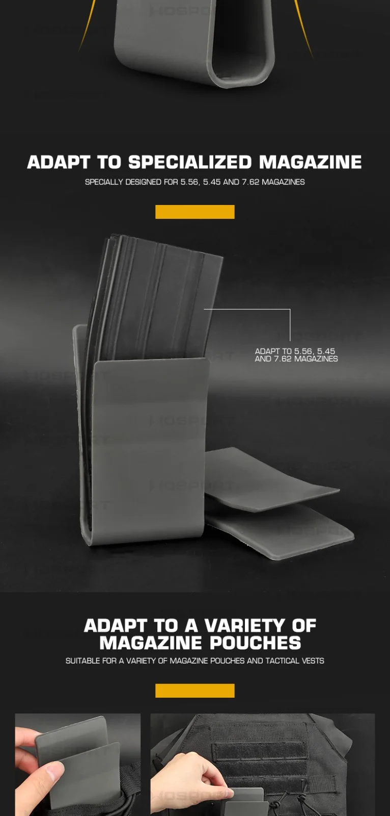El inserto de bolsa de nailon para revistas fue diseñado para revistas de rifle 5,56, 5,45, 7,62 y.308 para funcionar en bolsillos de nailon abiertos. Sin bungies y sin sacrificar la retención de la revista. El diseño de clic permite a los usuarios finales un disfrute suave de una fuente nueva sin afectar la capacidad de rápidamente