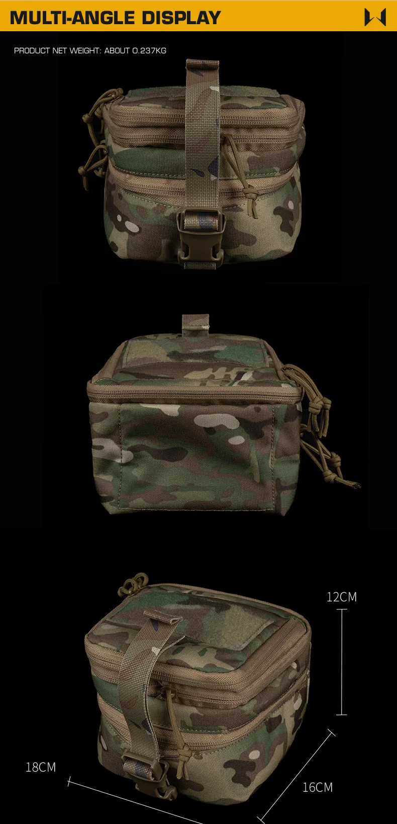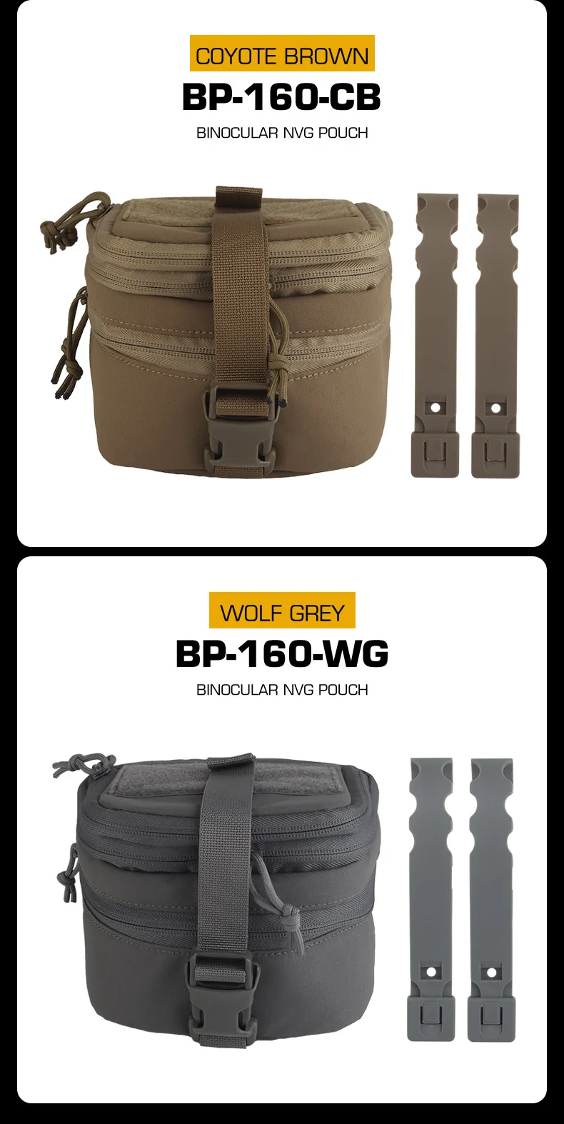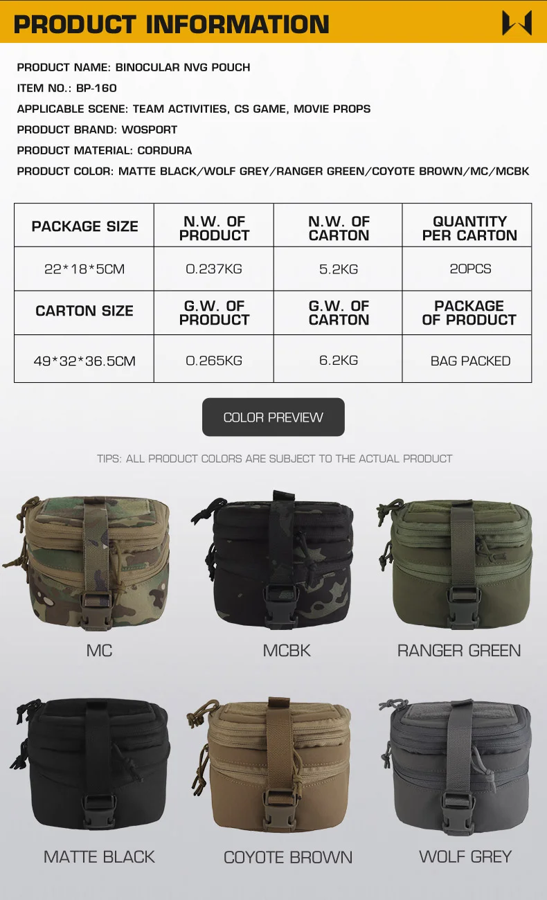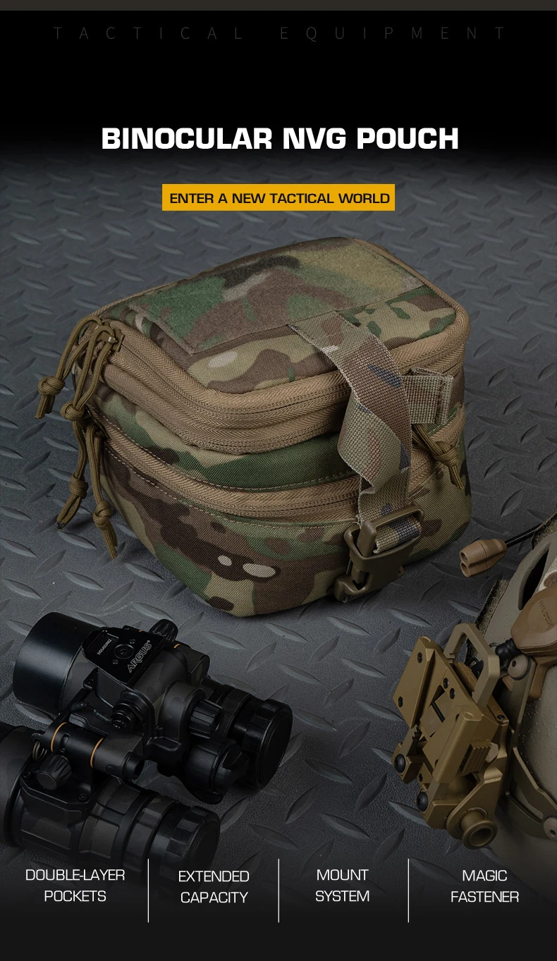 Características: 1. Diseño de doble capa: compartimentos separados para NVG y accesorios/herramientas 2.Bolsillo superior expandible: espacio de almacenamiento adicional para equipo adicional 3.Compatible con MOLLE: se fija de forma segura a sistemas tácticos de carga 4.Panel de gancho y bucle: montado en la parte superior para parches o luces estroboscópicas IR. Ideal para organizar y proteger dispositivos de visión nocturna de doble tubo mientras mantiene un acceso rápido a los elementos esenciales.