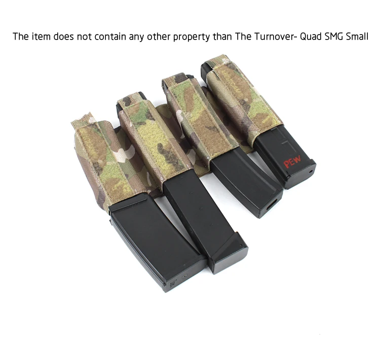 Turnover - Quad SMG Small retiene de forma segura hasta cuatro revistas SMG de estilo pequeño (como H & K MP5, Glock y similares) con retención elástica. Equipado con velcro de gancho en la parte posterior y velcro de bucle en la parte delantera. Diseñado alrededor del soporte de placa Slickster, pero es capaz de montarse en una amplia variedad de soportes de placa con un sistema de faja de velcro. También se integra en el Adapt Kangaroo Front Flap y el nuevo DOPE Front Flap para una mayor modularidad.