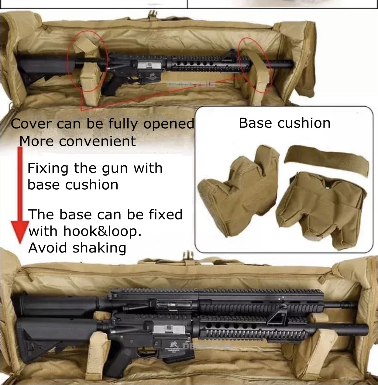 ● El estuche de dos armas largas cuenta con un compartimento principal de doble rifle con cojín de base fija para evitar que las armas tiemblen.