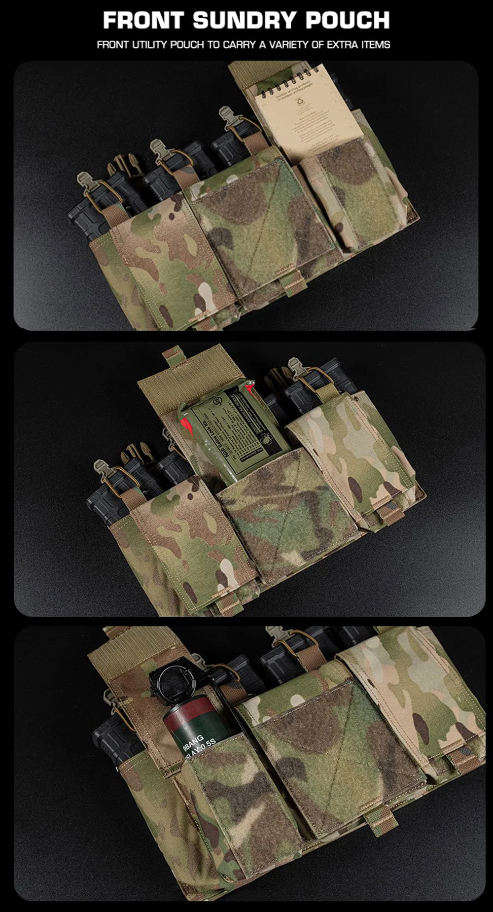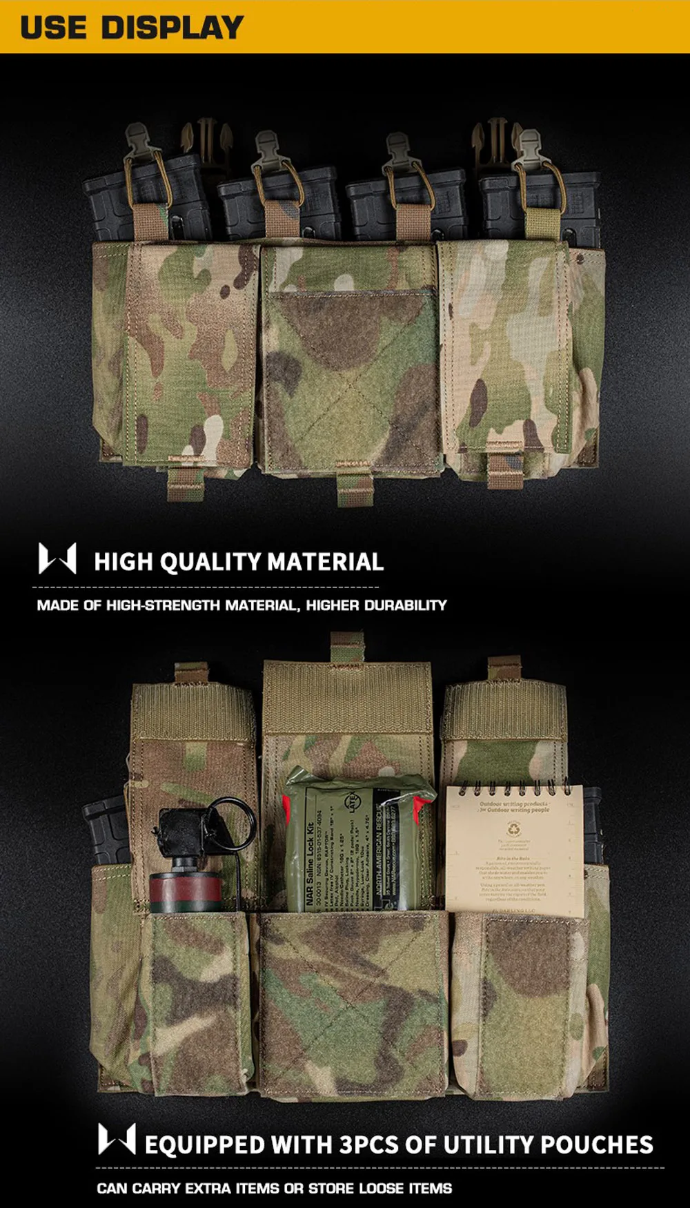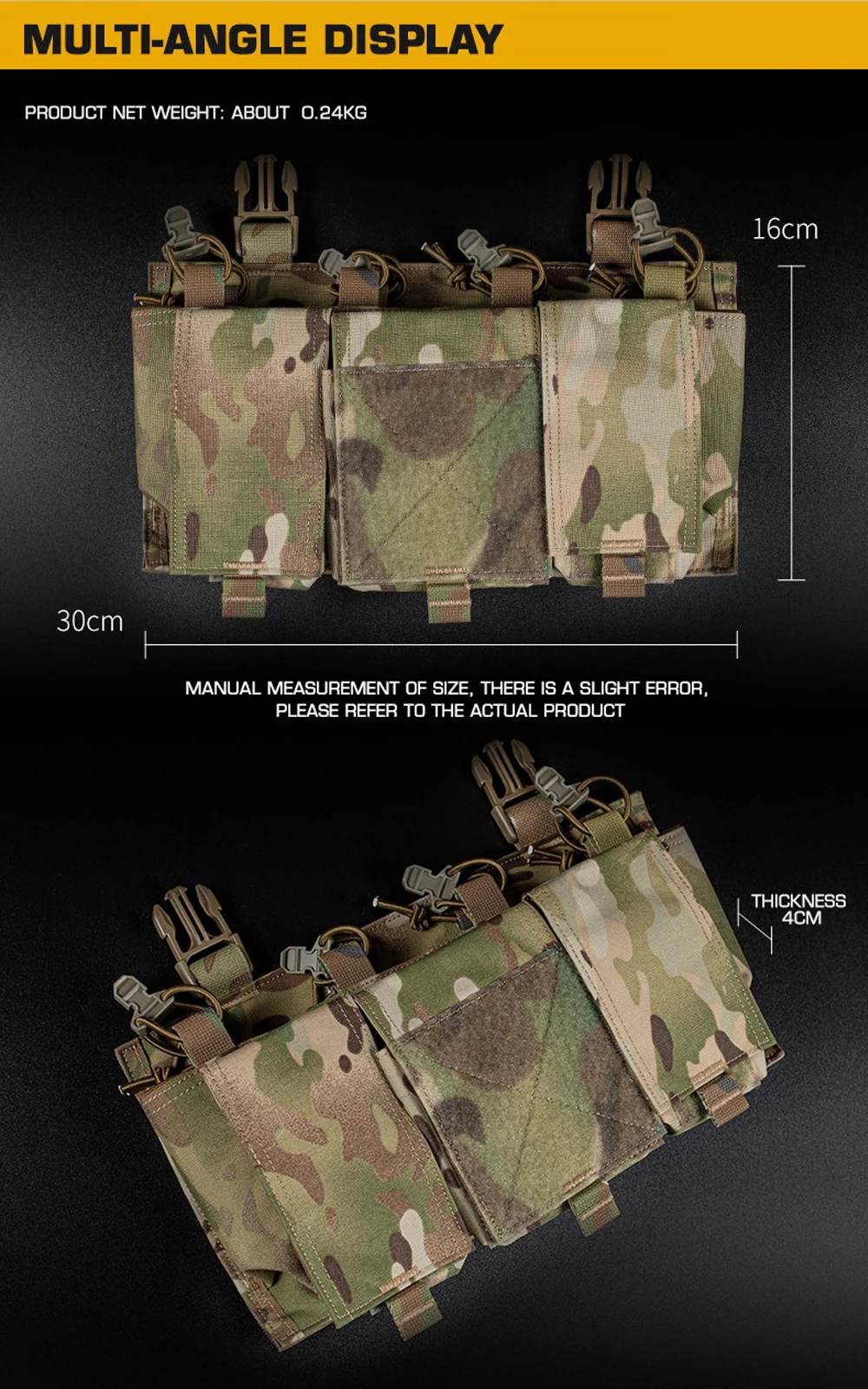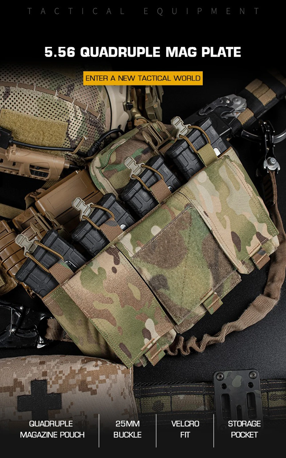 Nombre del producto: Placa cargadora cuádruple 5.56. Número de artículo.:VE-78-ACC-02 Tamaño del producto: 30*16*5cm Peso neto del producto: 0,24 KG Peso bruto del producto: 0,28 kg. Color del producto: negro mate/gris lobo/verde Ranger/marrón coyote/MC/MCBK Material principal: tela Cordura. Escena aplicable: caza, deportes al aire libre y otros deportes tácticos de Airsoft, etc.