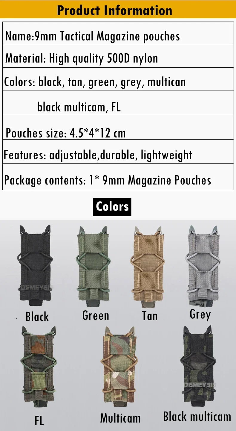 ● Capaz de contener cargadores de 9 mm o 5,56 mm, también puede contener una variedad de herramientas múltiples, cuchillos y linternas más pequeñas.La tensión ajustable le permite sujetar de forma segura sus accesorios.