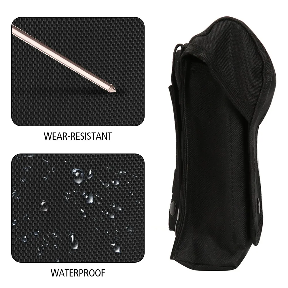 Hay 2 cinturones de nailon gruesos con botón a presión en la parte posterior y las correas se pueden ajustar según sea necesario para evitar resbalones.Con Módulo Molle, se puede colgar en el equipo con módulo MOLLE, chaleco táctico, mochila, cinturón, etc.