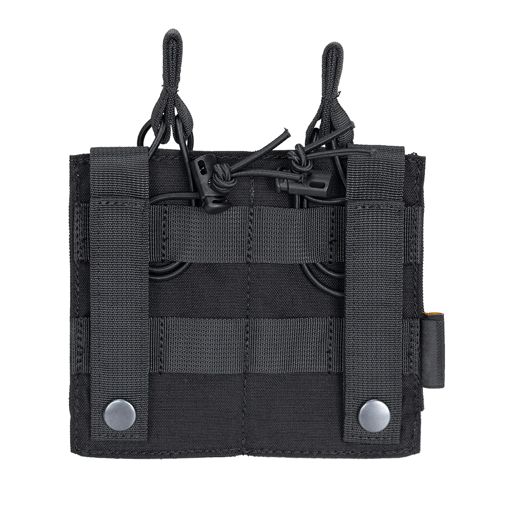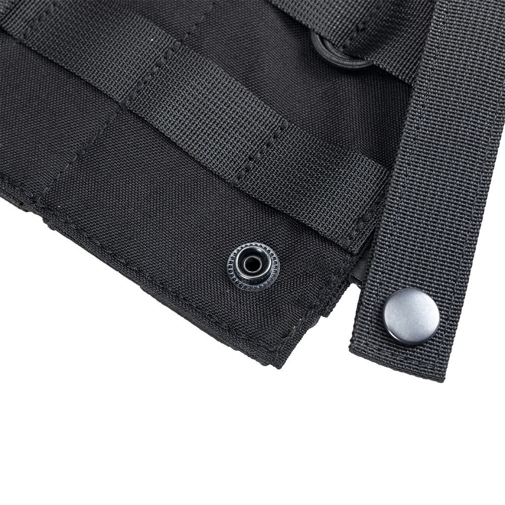 The back side: there are 2 thick nylon belt with snap button on the back, and the straps can be adjusted as needed to prevent slipping. This product can be perfectly matched with this series of products such as tactical vests,bags and drop leg platforms.