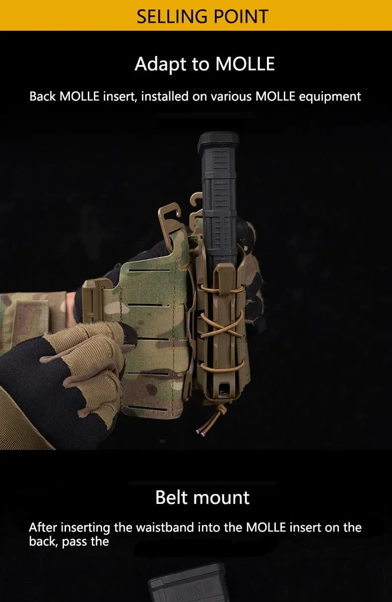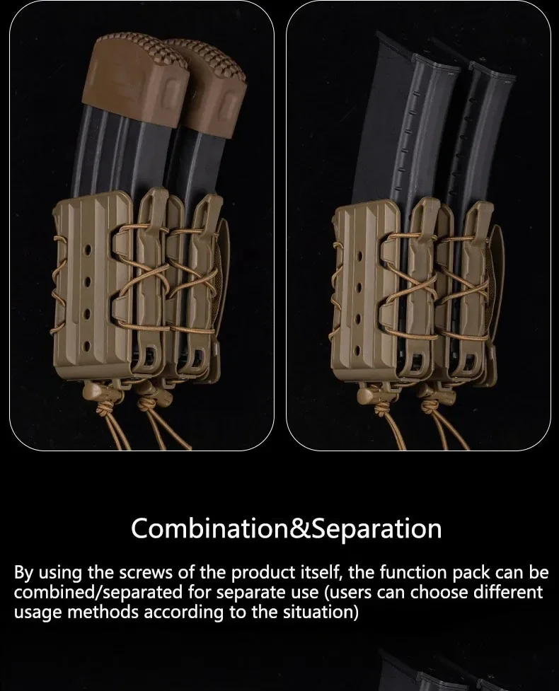 La bolsa ofrece un ajuste y retención altamente adaptables conocidos en un paquete elegante, impermeable y fácil de limpiar.Presenta un sistema de cordones rornillados que facilita el ajuste y la reconfiguración, y nervaduras que retienen las colas del cordón del amortiguador para una apariencia limpia.Este doble combo puede contener 2 cargadores de rifle o artículos de tamaño similar, simultáneamente