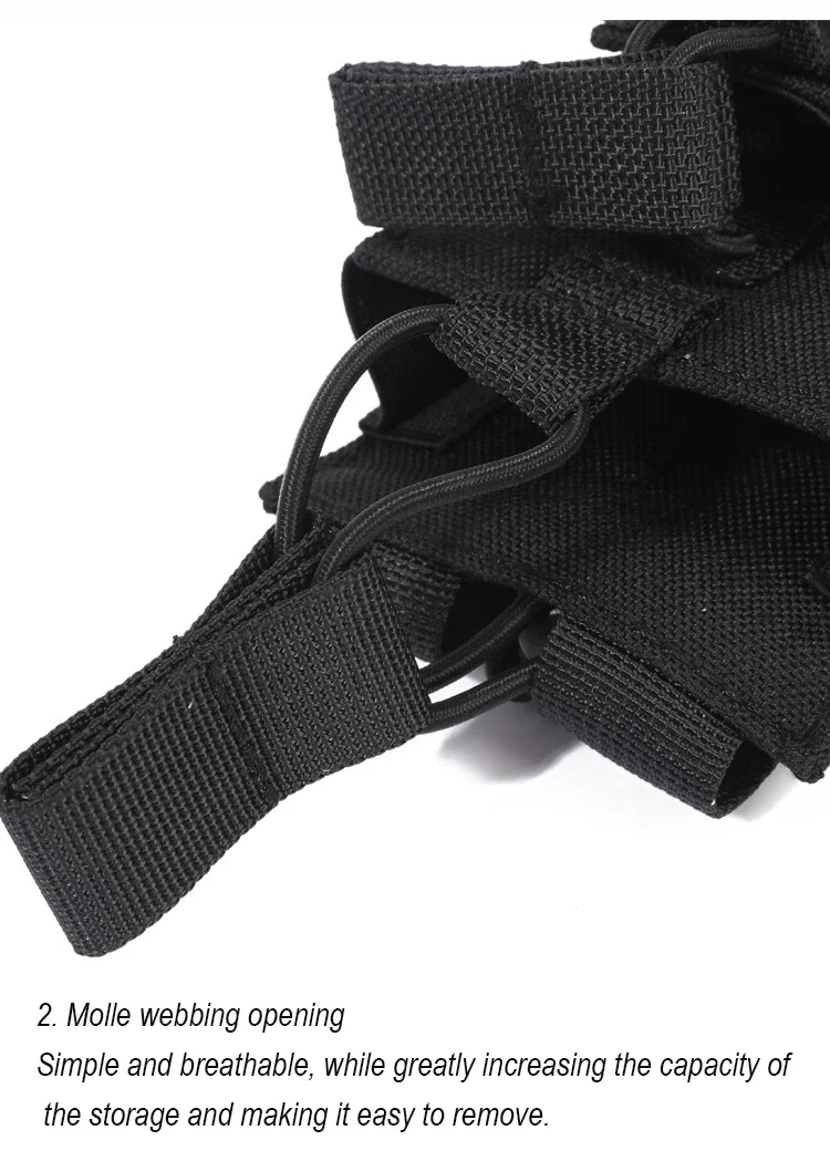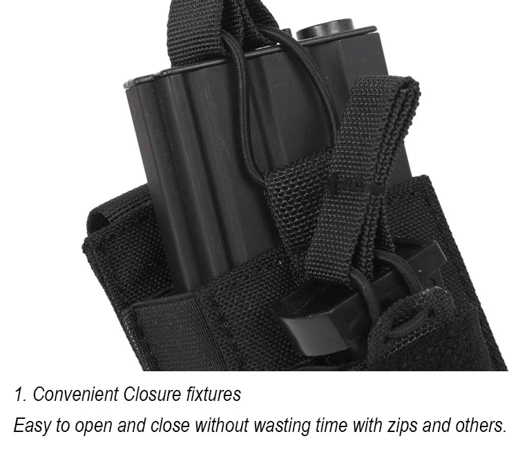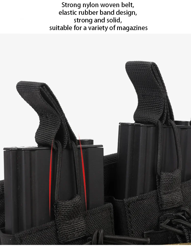 【Acceso rápido】- Las cuerdas elásticas se pueden ajustar para mantener cualquier capacidad de carga en su lugar de forma segura sin temor a perder una revista, lengüetas consideradas en la parte superior abierta para una recarga rápida y un fácil agarre en una situación apresurada.