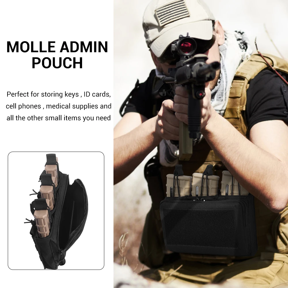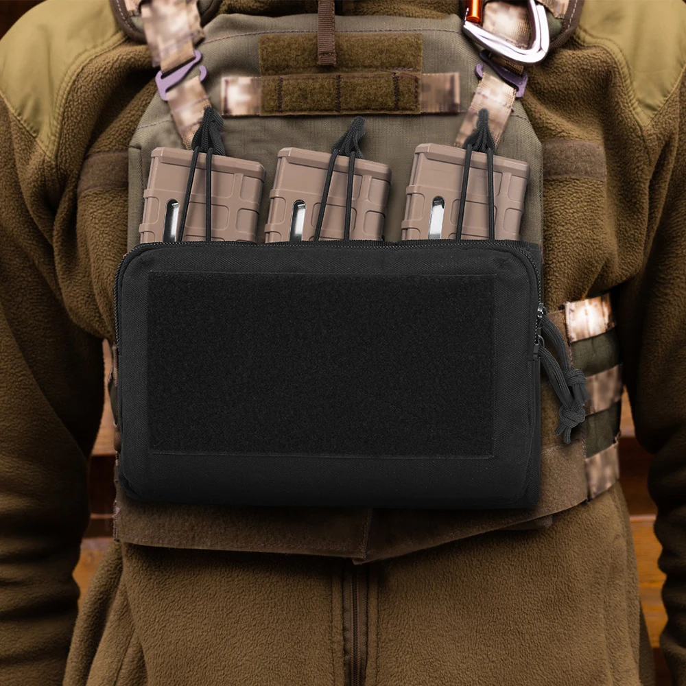 Tactical Magazine Admin pouch with open-top rear triple mag pouch offers ample space to hold three magazines with no issues such as 5.56/7.62mm magazines. Feature adjustable bungee retention and webbing pull tab for maximum grip and fast draw, securing the magazine until needed.