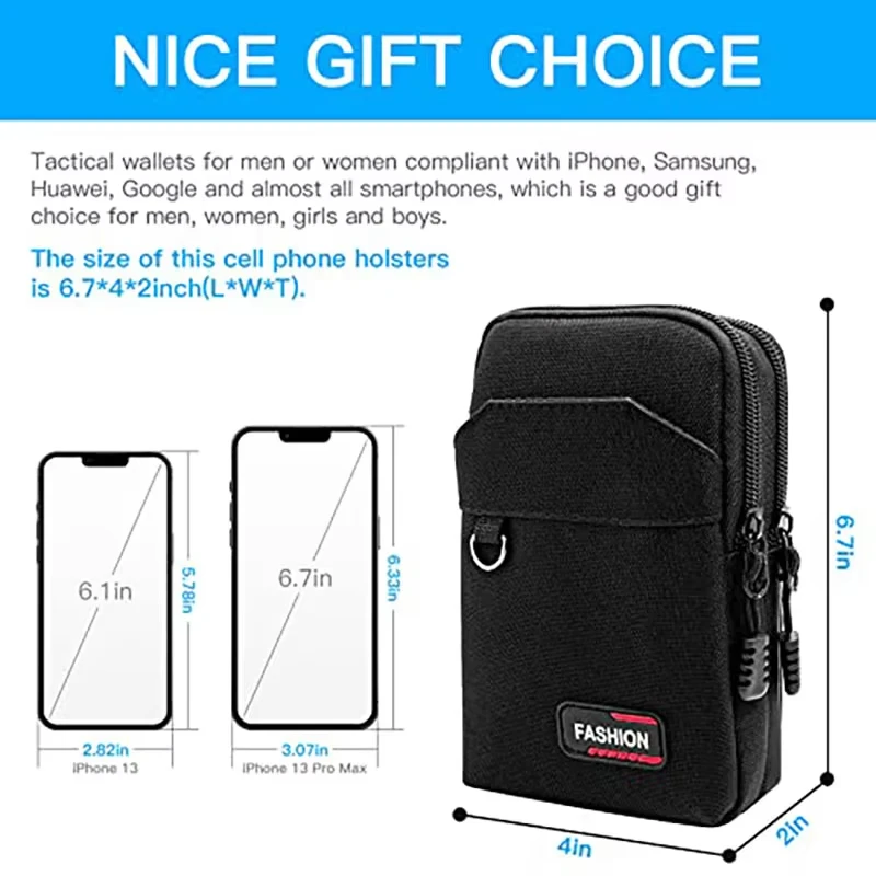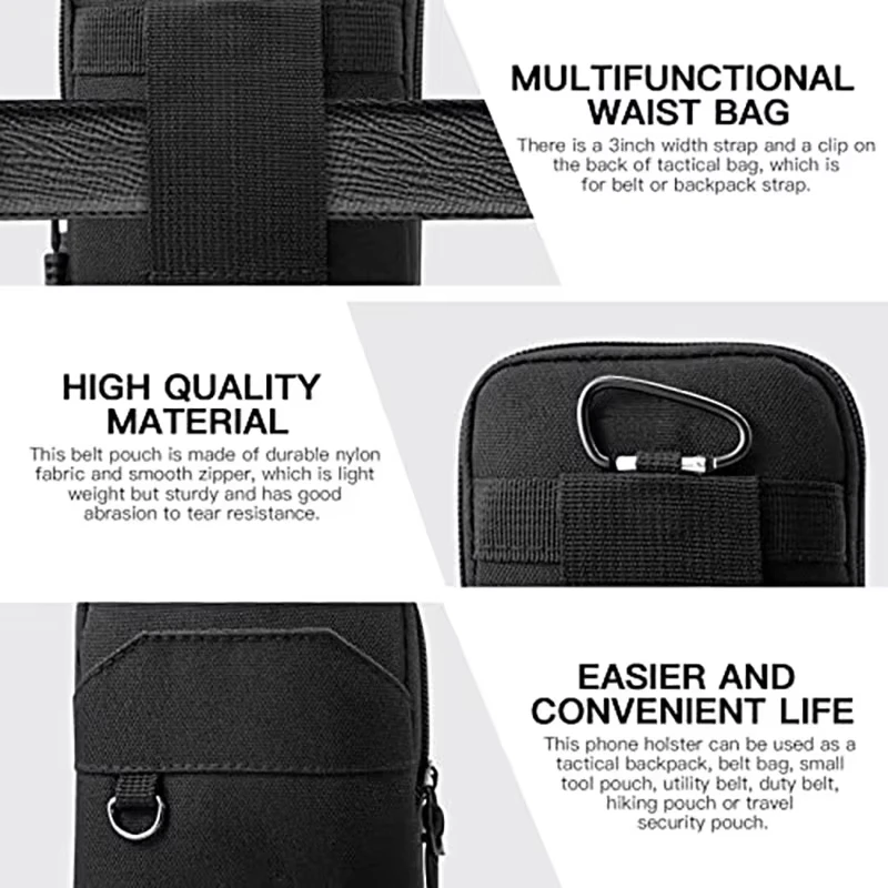 [Multifunctional Waist Bag] There is a 3inch width strap and a clip on the back of tactical bag, which is for belt or backpack strap. This phone holster can be used as a tactical backpack, belt bag, small tool pouch, utility belt, duty belt, hiking pouch or travel security pouch. This tactical wallet is suitable for travelling, cycling, hiking, camping and daily work.