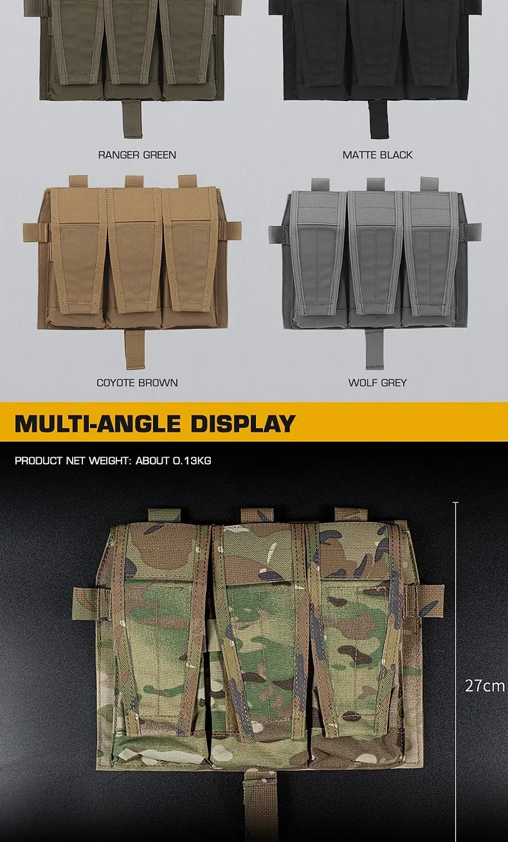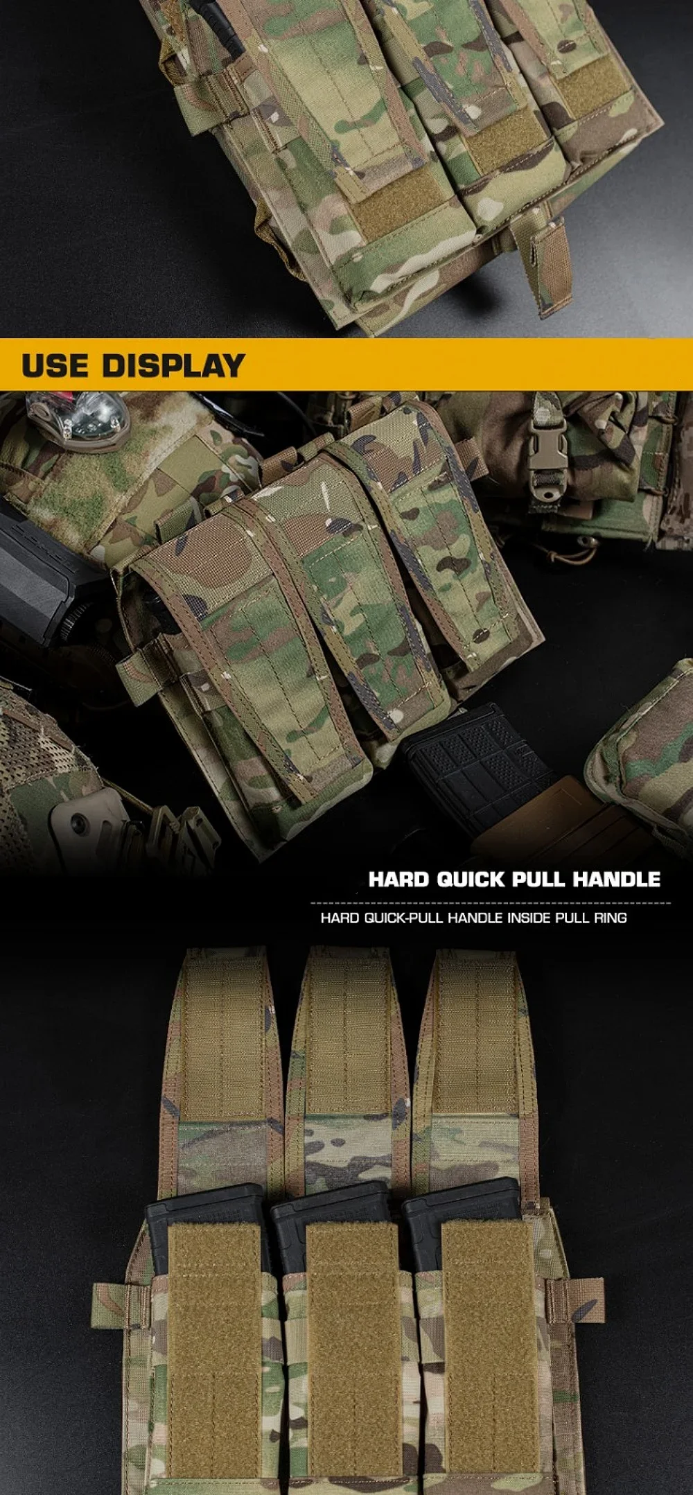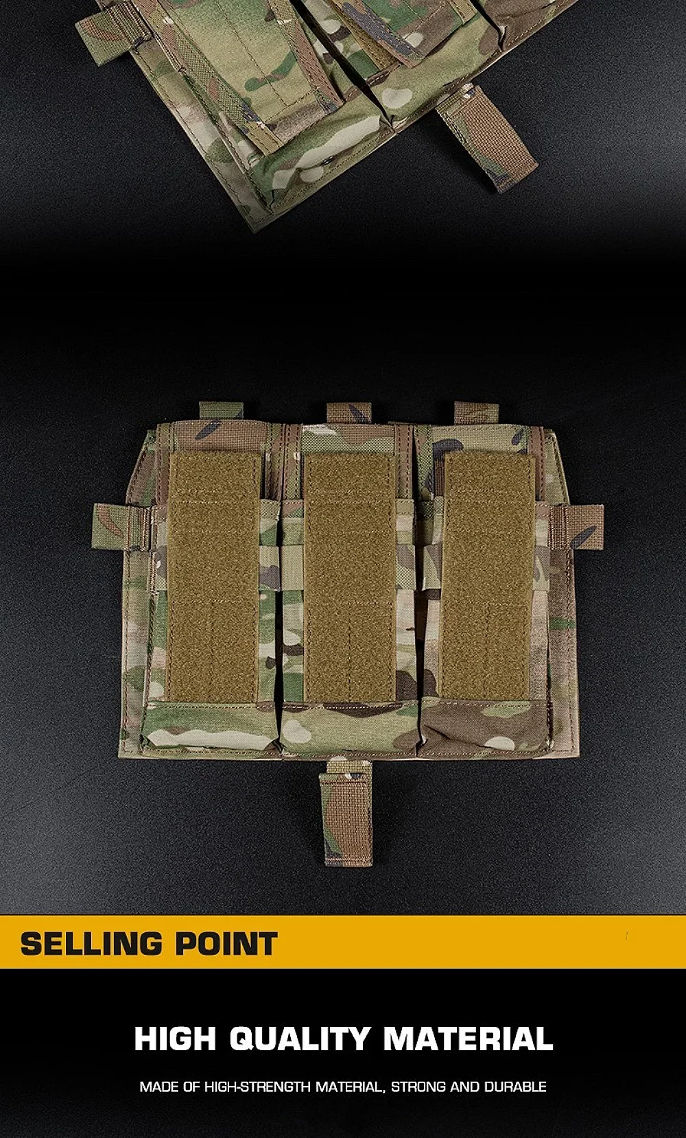 Puede contener tres cargadores de 5,56.※ El interior de la solapa está hecho de material duro, que es fácil de operar cuando se usan guantes.※ Hay orificios de drenaje en la parte inferior para un drenaje rápido.※ La parte inferior está equipada con broches para combinar el chaleco con más firmeza y evitar que se afloje.※ Compatible con varios chalecos tácticos de la empresa CP.