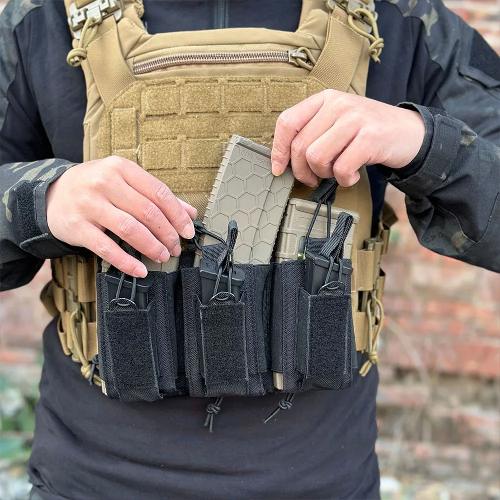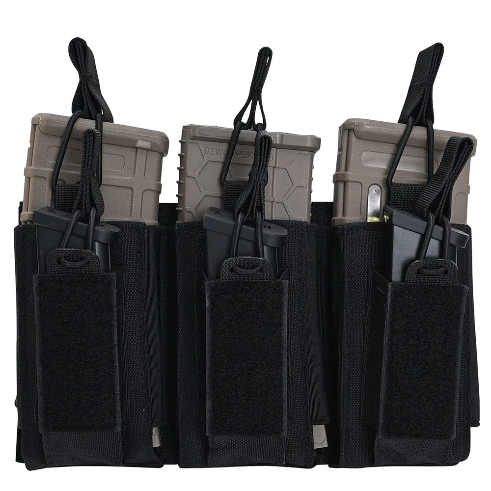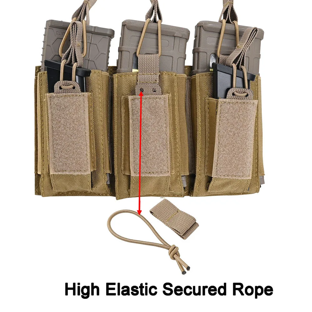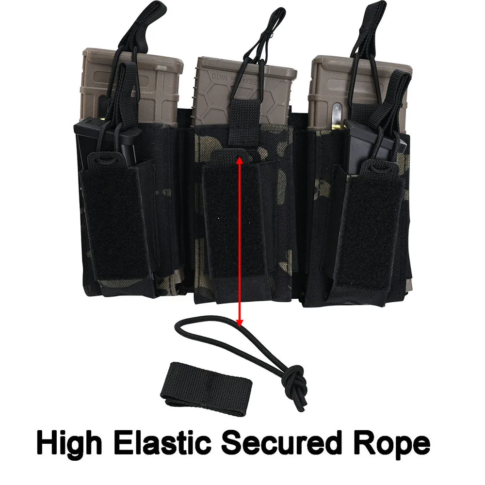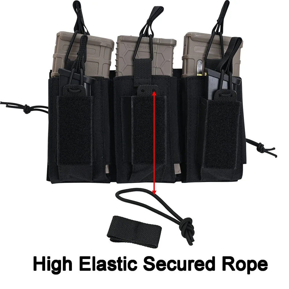 【ALTAMENTE COMPATIBLE】Diseñado para sostener de forma segura tres cargadores de rifle y 3 bolsas Mag para pistola, esta bolsa cuenta con tiradores elásticos ajustables para un diseño abierto superior para facilitar el acceso a su revista, acomodando la mayoría de los cargadores de pistola de doble pila. Es compatible con M4, M14, M16, AR15/233, G36 y Glock, M1911 y 92F revistas de pistola.