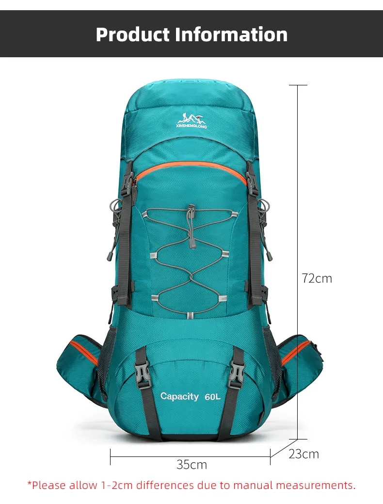Lista del Paquete 1 X Mochila (la cubierta de lluvia está en el bolsillo inferior de la cremallera. Nota: el color de la cubierta de lluvia es aleatorio. Capacidad: 60L