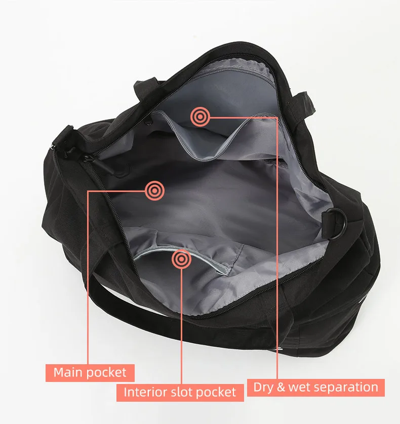 2.Bolsillos independientes de separación húmedo y seco y compartimento independiente para zapatos