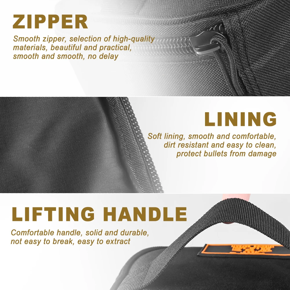 Material de tela Oxford 1.600D: la bolsa tipo bala presenta alta resistencia, excelente resistencia al impacto, buena elasticidad, resistencia superior al calor, buena absorción de agua, resistencia al desgaste y resistencia a la luz.También ofrece una excelente transpirabilidad, propiedades de absorción de humedad y capacidad de bloqueo de la luz, lo que lo hace ideal para almacenar y recoger carcasas tipo bala, extendiendo así su vida útil.