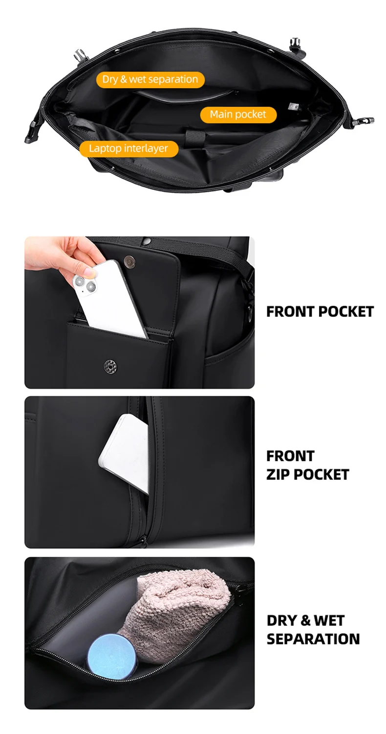 1. Large-capacity main bag set up, built-in wet and dry separation bag and built-in compartment bag, partition storage, travel more convenient
