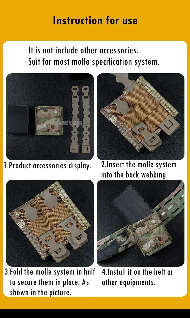 ● El sistema MOLLE en la parte posterior garantiza que la bolsa sea compatible con cualquier MOLLEEquipo, capaz de ser montado en un cinturón táctico, mochila, chaleco táctico o cualquier otro sistema MOLLE.
