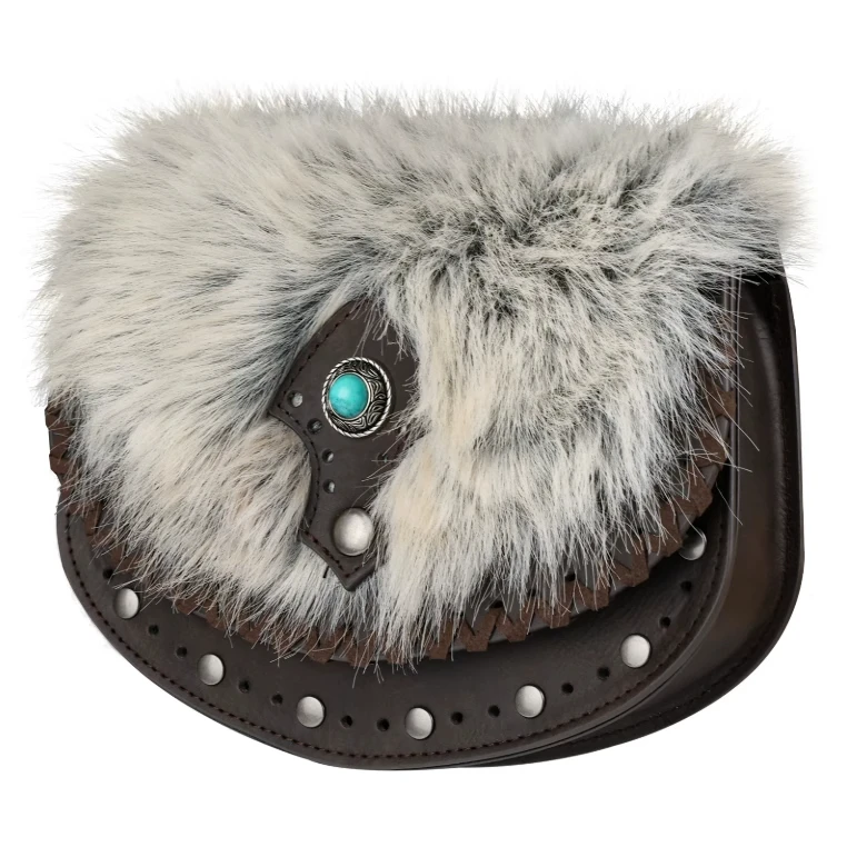 Detalles de estilo: Hecho de piel sintética y decorado con elementos de felpa gris y blanco, junto con hebillas decorativas de piedras preciosas turquesas y remaches de metal, recrea el aspecto nórdico retro;