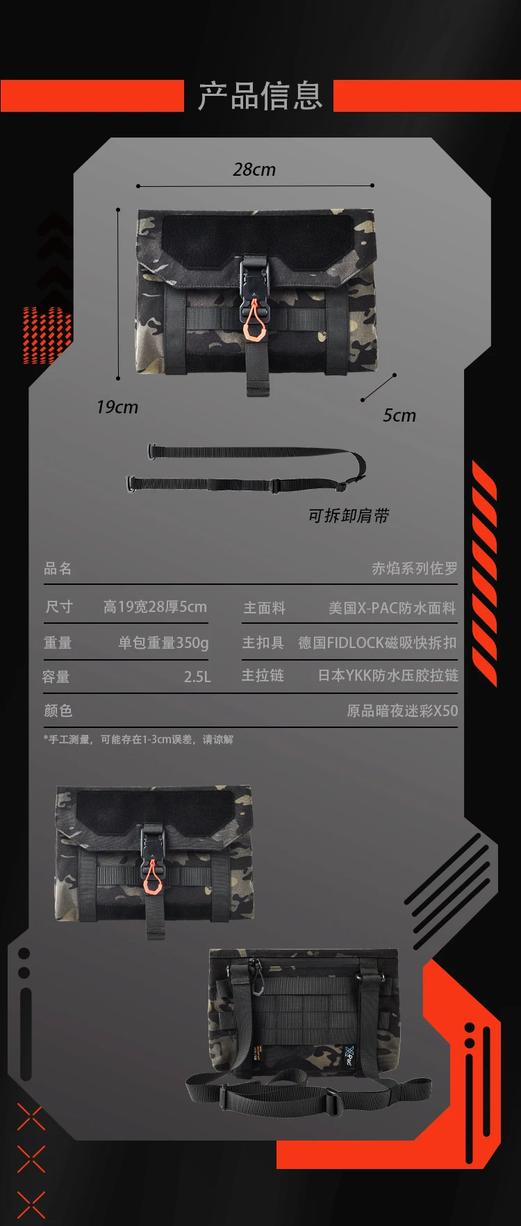 Dimensiones: altura 19, ancho 28, grosor 5cm Material principal: tela impermeable americana de