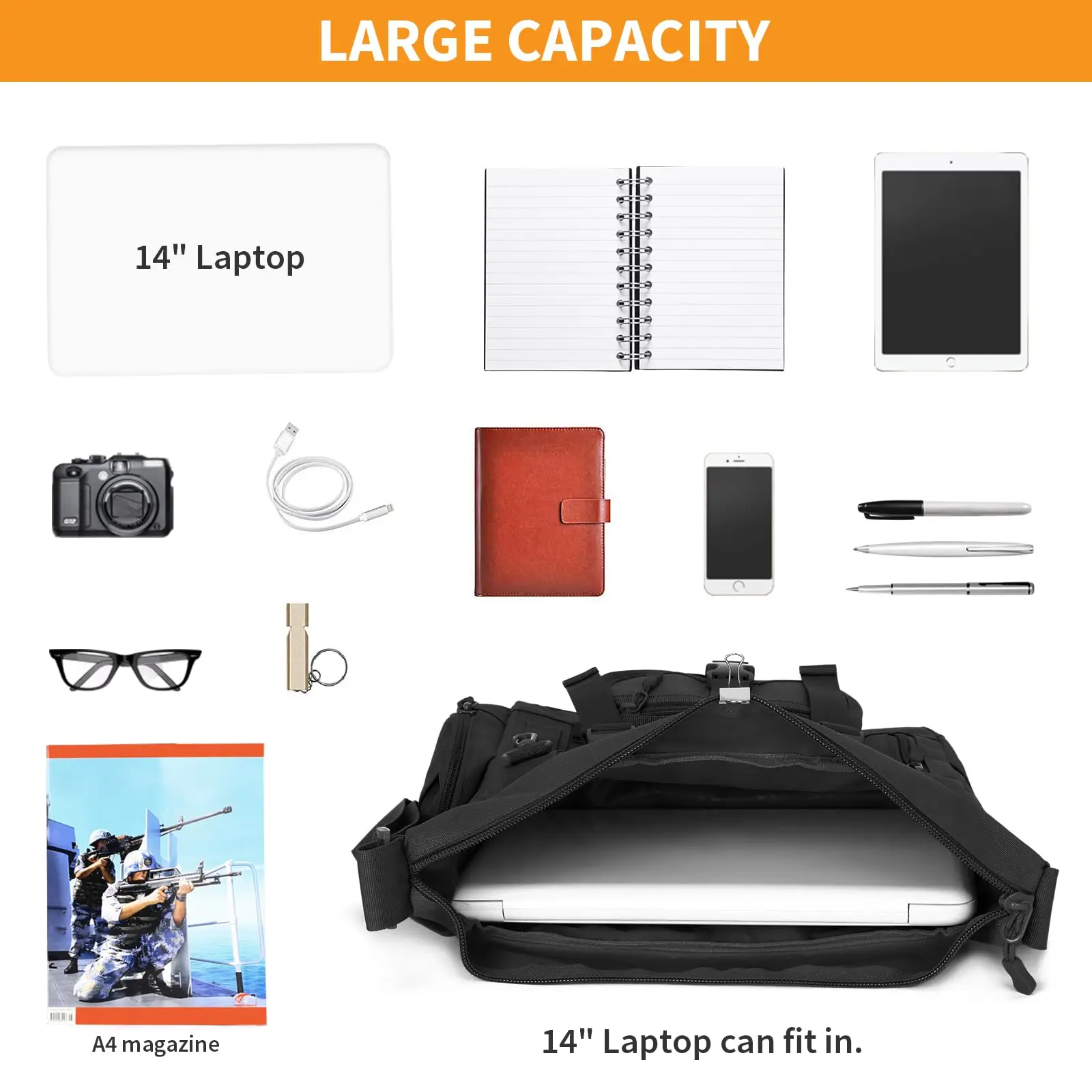 Estructura: 1 x bolsillo con cremallera, 1 x bolsillo frontal tipo cubo, 1 x bolsillo vertical con cremallera, 1 x bolsillo lateral con cremallera, 1 x bolsillo trasero con cremallera, 1 x compartimento principal.El compartimento principal tiene capacidad para una computadora portátil de 14 pulgadas, cargadores A4 y una botella de agua de 550 ml.