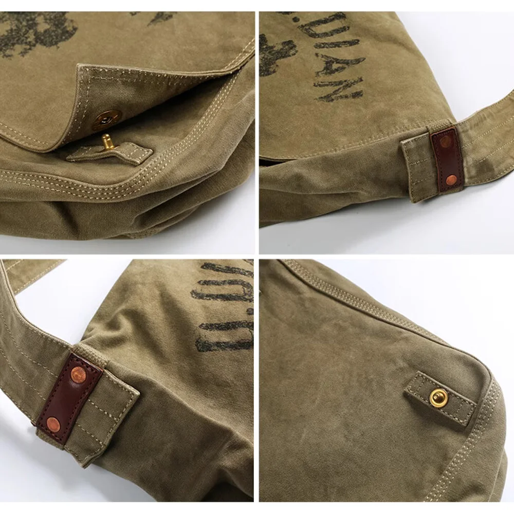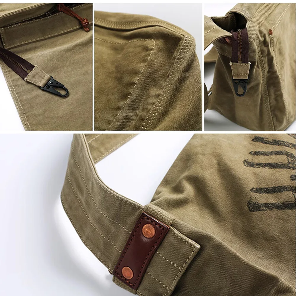 Este paquete de productos es un paquete de cartero antiguo de lavado manual, la precipitación del color es muy buena, estilo de moda, utilizado como bolsa cruzada, telas de bolsa para lienzo de cifrado, con cuero de vaca superior, copia una bolsa durante la Segunda Guerra Mundial, la bolsa del bolsillo principal es muy grande, hay una pequeña, En la parte inferior del cojín de la bolsa, puede acomodar un portátil de 14 pulgadas. La longitud total de la correa del hombro era de 98cm.