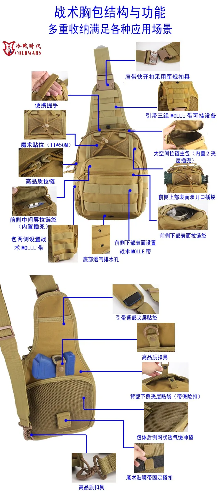 Correas con especificaciones militares y sujetadores de PE de alta calidad.Diseño de almacenamiento tridimensional y sistema MOLLE