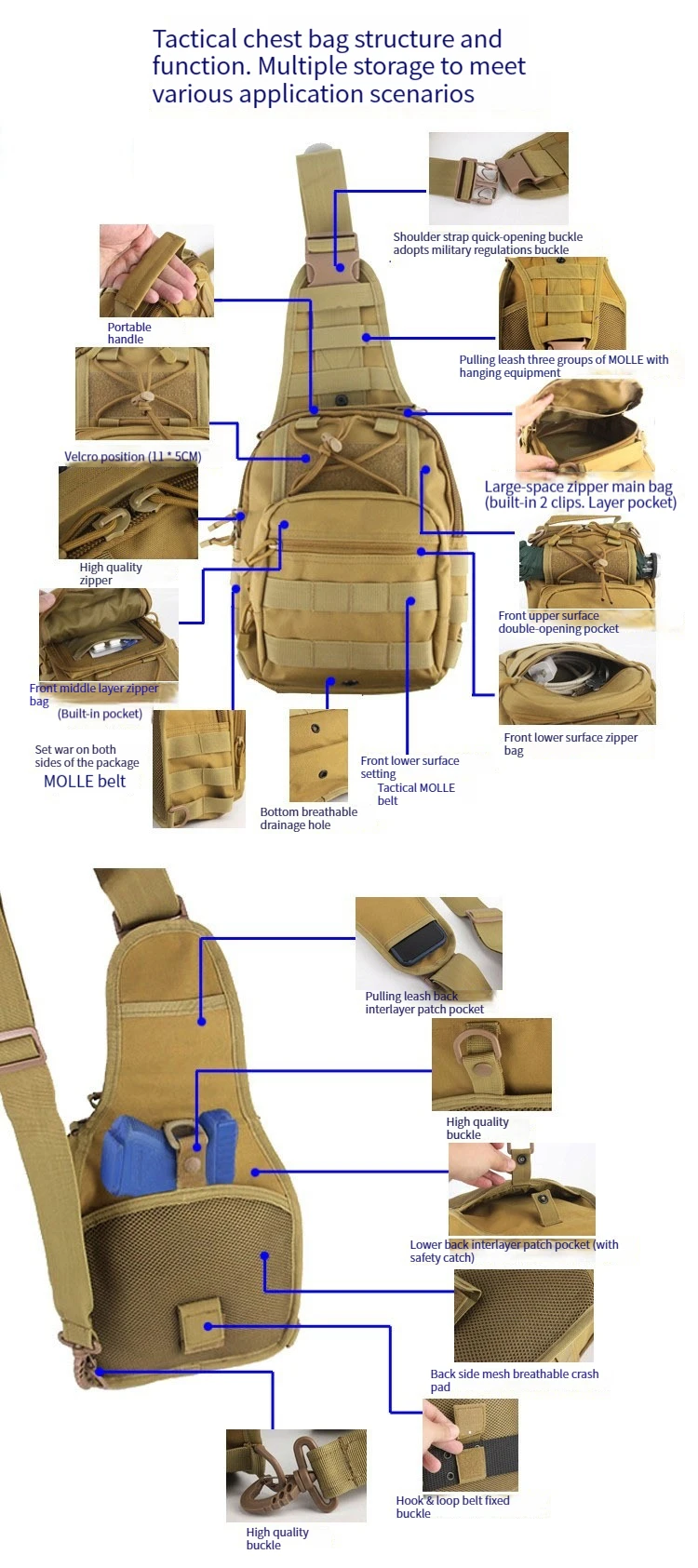 Esta bolsa sigue utilizando tela de nailon impermeable 900D, un forro de nailon ligero, una capa de amortiguación en la parte posterior de malla y tela transpirable. Correas militares y sujetadores de PE de alta calidad. Al adoptar un diseño de almacenamiento tridimensional y un sistema MOLLE, se puede lograr un almacenamiento de gran capacidad en pequeñas dimensiones externas, mientras que también se puede lograr una extensión adicional a través del almacenamiento externo multipunto. La correa de hombro individual adopta una correa de liberación rápida de doble punto similar a la forma de la correa de respuesta rápida del subfusil. La cabeza tiene una hebilla de liberación rápida que se puede separar rápidamente, y la cola de la correa se puede utilizar para mover rápidamente la bolsa en el cuerpo a través de la transposición bilateral. Al mismo tiempo, el diseño del lazo de enlace del cinturón de velcro en la parte posterior inferior de la bolsa se refiere al concepto del cinturón de fijación horizontal de la máscara de gas de estilo soviético, pero el diseño de la correa de enlace directo es más simple y conveniente que el diseño de la correa auxiliar horizontal tipo A, Que puede garantizar la estabilidad de la bolsa en el caso de correr, ciclismo, escalada en roca, descenso y otros deportes violentos. Y su versión básica como paquete de pecho táctico especializado garantiza su excelente rendimiento de servicio. El diseño es aplicable principalmente a escenas tácticas como patrullas y tareas, así como a varias escenas deportivas al aire libre como ciclismo, pesca, senderismo y montañismo.