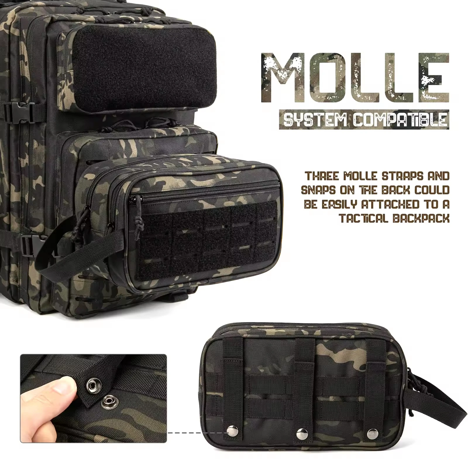 Diseño versátil: la bolsa de higiene cuenta con un práctico asa de transporte lateral y un diseño suave en el bolsillo frontal, lo que le permite sujetar bolsillos pequeños, bolsillos para botellas de agua y accesorios.Las tres correas verticales y el botón a presión de metal en la parte posterior le permiten agregar la bolsa a la mochila táctica u otro equipo táctico como una bolsa adicional para exteriores.