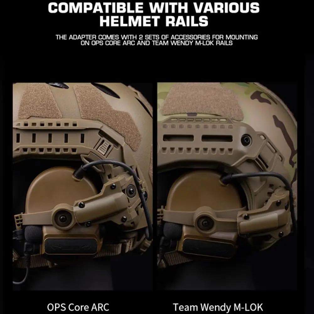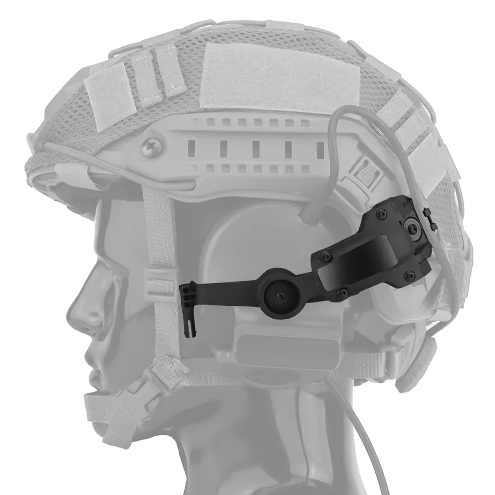 The headset cable can be fixed on the bracket.Rail mount arms attach to the sides of the helmet's ARC rails to free up front space.
