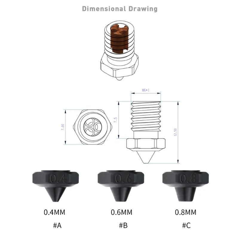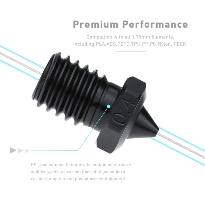 Especificaciones:Material: alto flujo para boquilla de acero endurecido E3DV6 Clone CHT