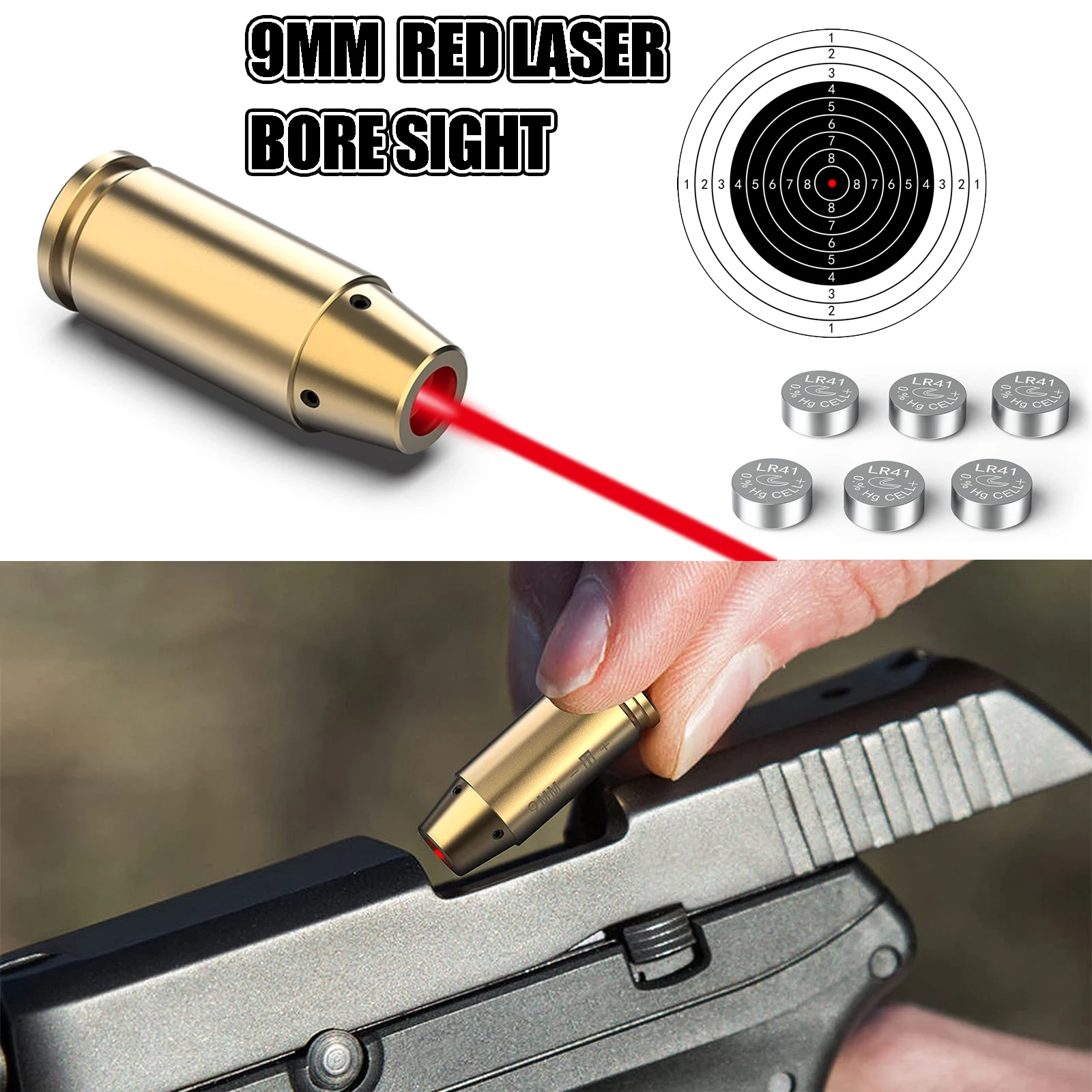 Bore Sight Boresighter con láser rojo de 9 mm con 3 juegos de baterías adicionales