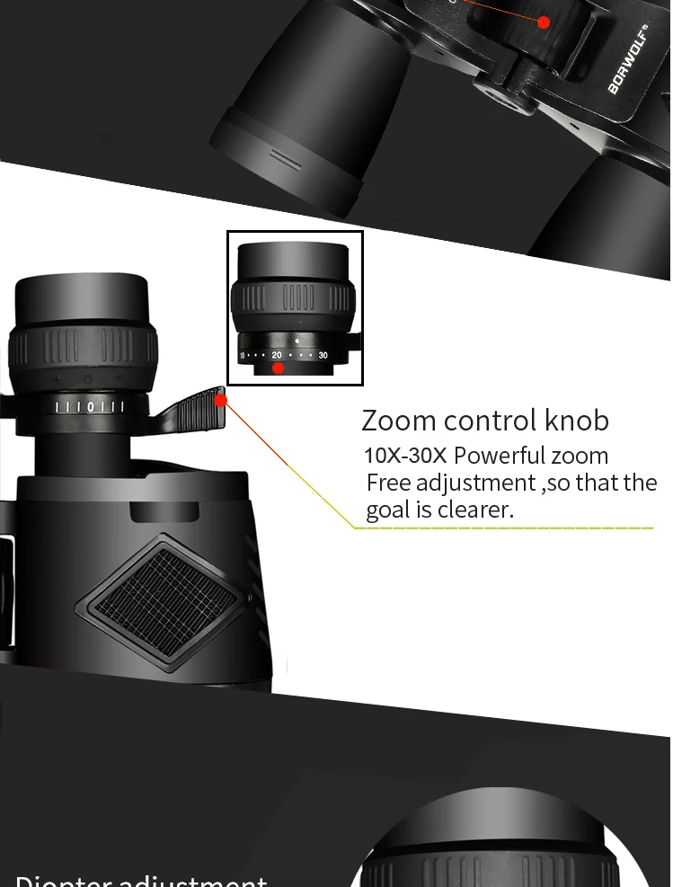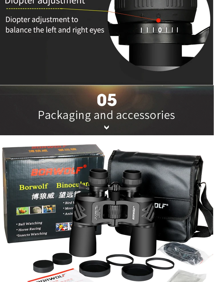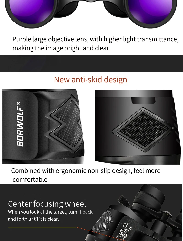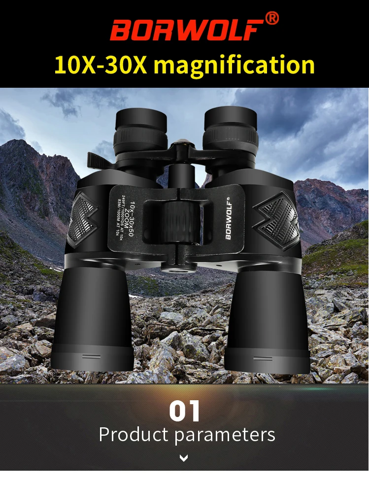 Binoculares BORWOLF perfectos para observar aves, cazar, acampar, viajar, secenery y otras actividades. Para ver 10X-30X más cerca con una imagen clara y brillante con una lente ancha de 50mm de diámetro del objetivo. Gran campo de visión (249FT /1000YDS ) . Fácil enfoque perfecto para senderismo, caza, escalada, observación de aves, observación de Vida Silvestre y paisajes. Prisma de gran y elementos de lente FMC totalmente multicapa. Fortalece la función clave de un monocular, garantiza una transmisión de luz y brillo superiores, lo que hace que su visión sea más clara y ofrece imágenes nítidas. Su propiedad de sellado garantiza funciones impermeables, antivaho y a prueba de polvo. Armadura de goma con rayas hace que sea cómodo de usar, aumenta la fricción, evita que se salga de la mano y su acabado de goma tiene resistencia a los golpes.