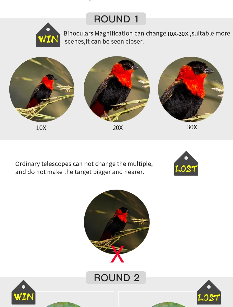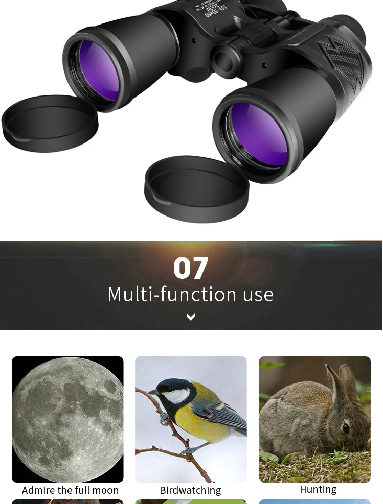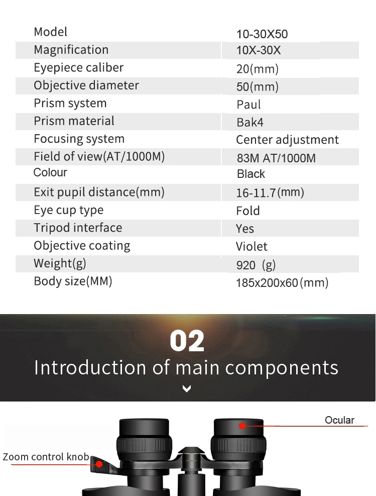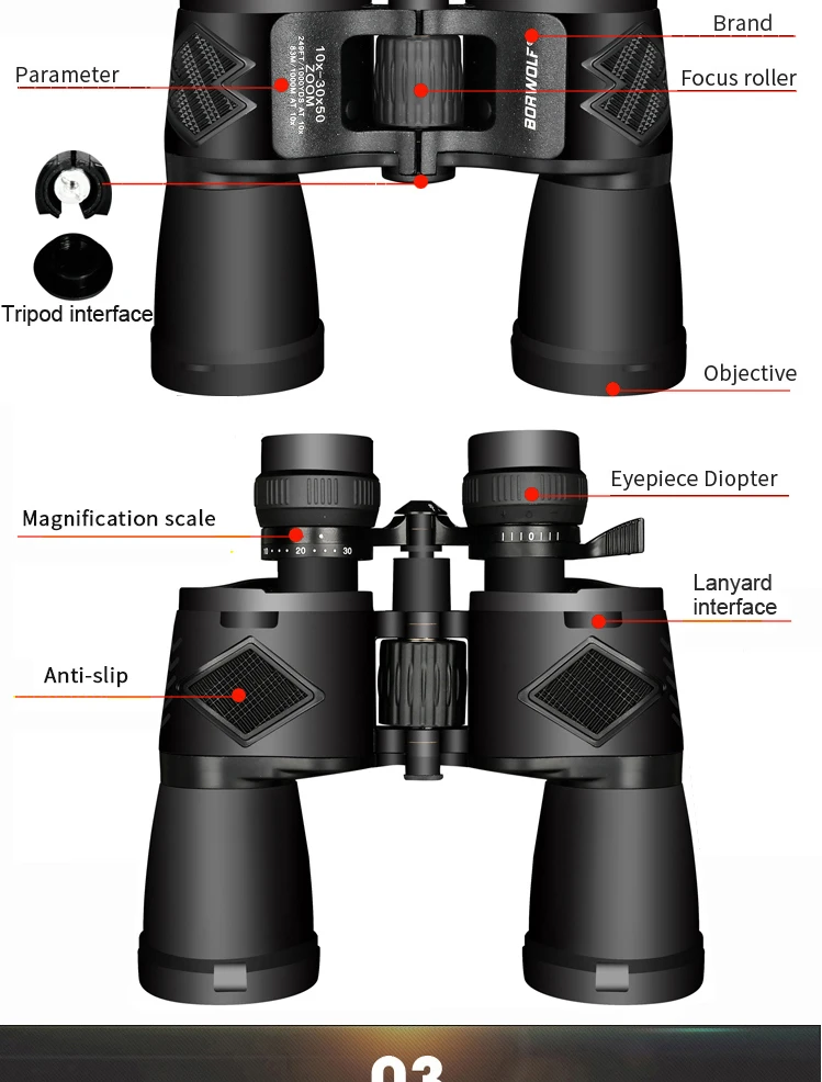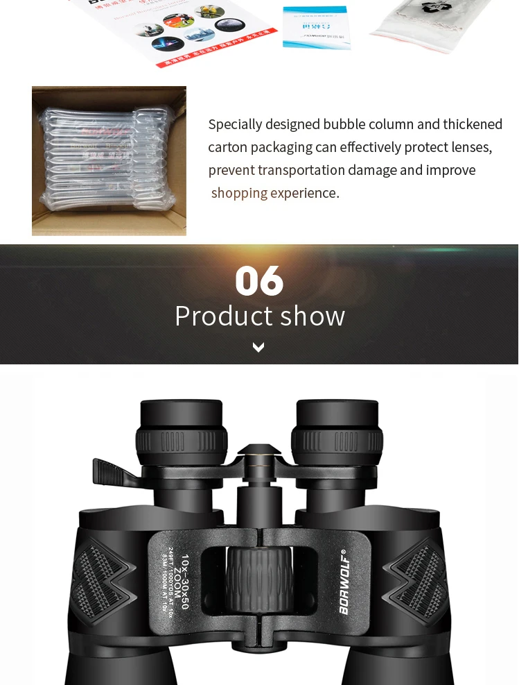 Binoculares BORWOLF perfectos para observar aves, cazar, acampar, viajar, secenery y otras actividades. Para ver 10X-30X más cerca con una imagen clara y brillante con una lente ancha de 50mm de diámetro del objetivo. Gran campo de visión (249FT /1000YDS ) . Fácil enfoque perfecto para senderismo, caza, escalada, observación de aves, observación de Vida Silvestre y paisajes. Prisma de gran y elementos de lente FMC totalmente multicapa. Fortalece la función clave de un monocular, garantiza una transmisión de luz y brillo superiores, lo que hace que su visión sea más clara y ofrece imágenes nítidas. Su propiedad de sellado garantiza funciones impermeables, antivaho y a prueba de polvo. Armadura de goma con rayas hace que sea cómodo de usar, aumenta la fricción, evita que se salga de la mano y su acabado de goma tiene resistencia a los golpes.