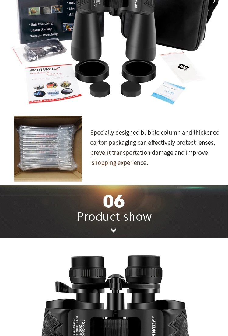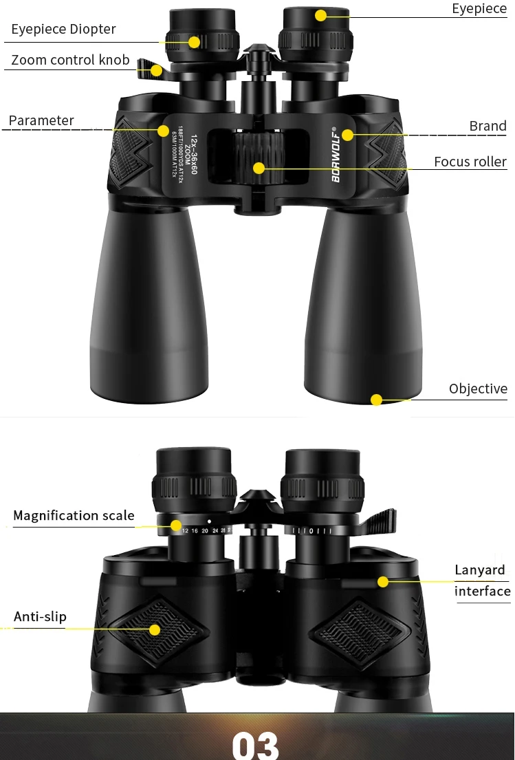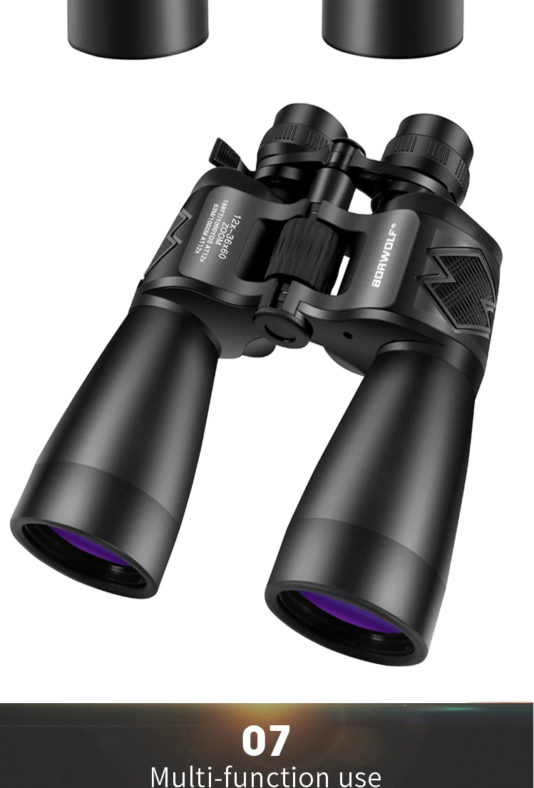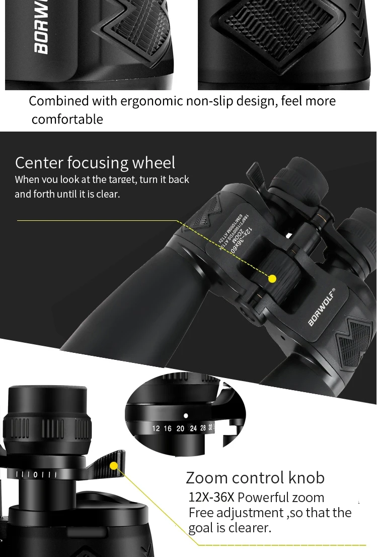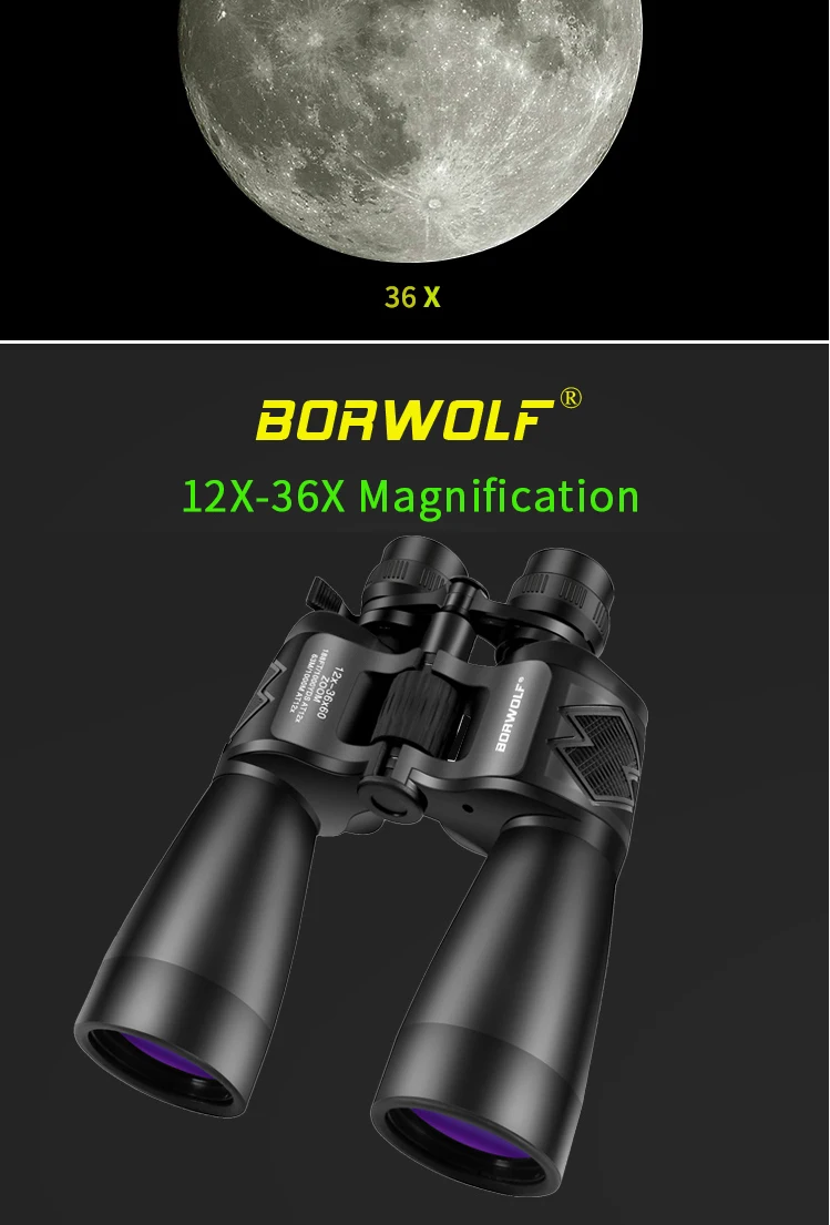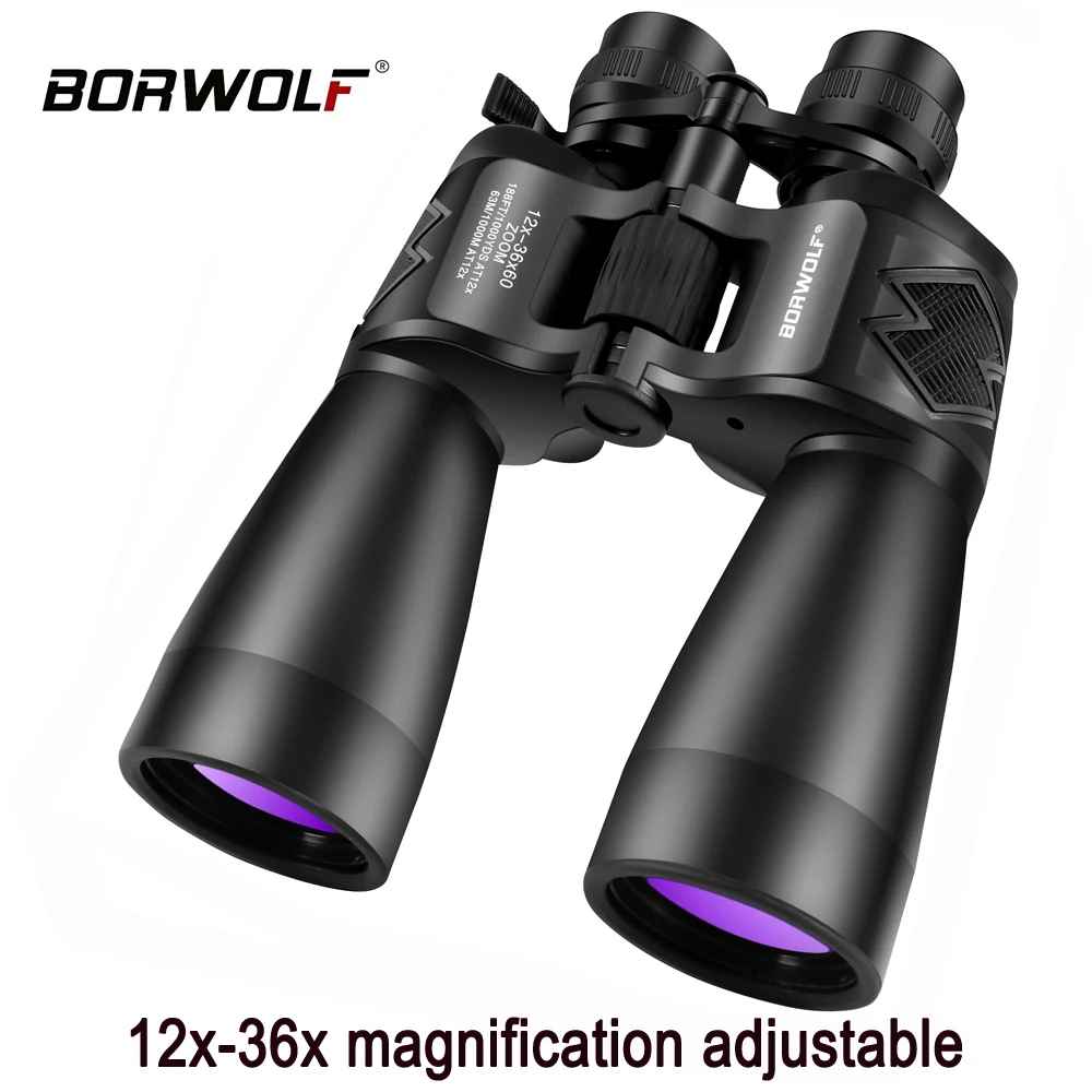 Borwolf 12-36X60 Binoculares potentes Gafas de campo con zoom Gran telescopio de mano para observación de aves