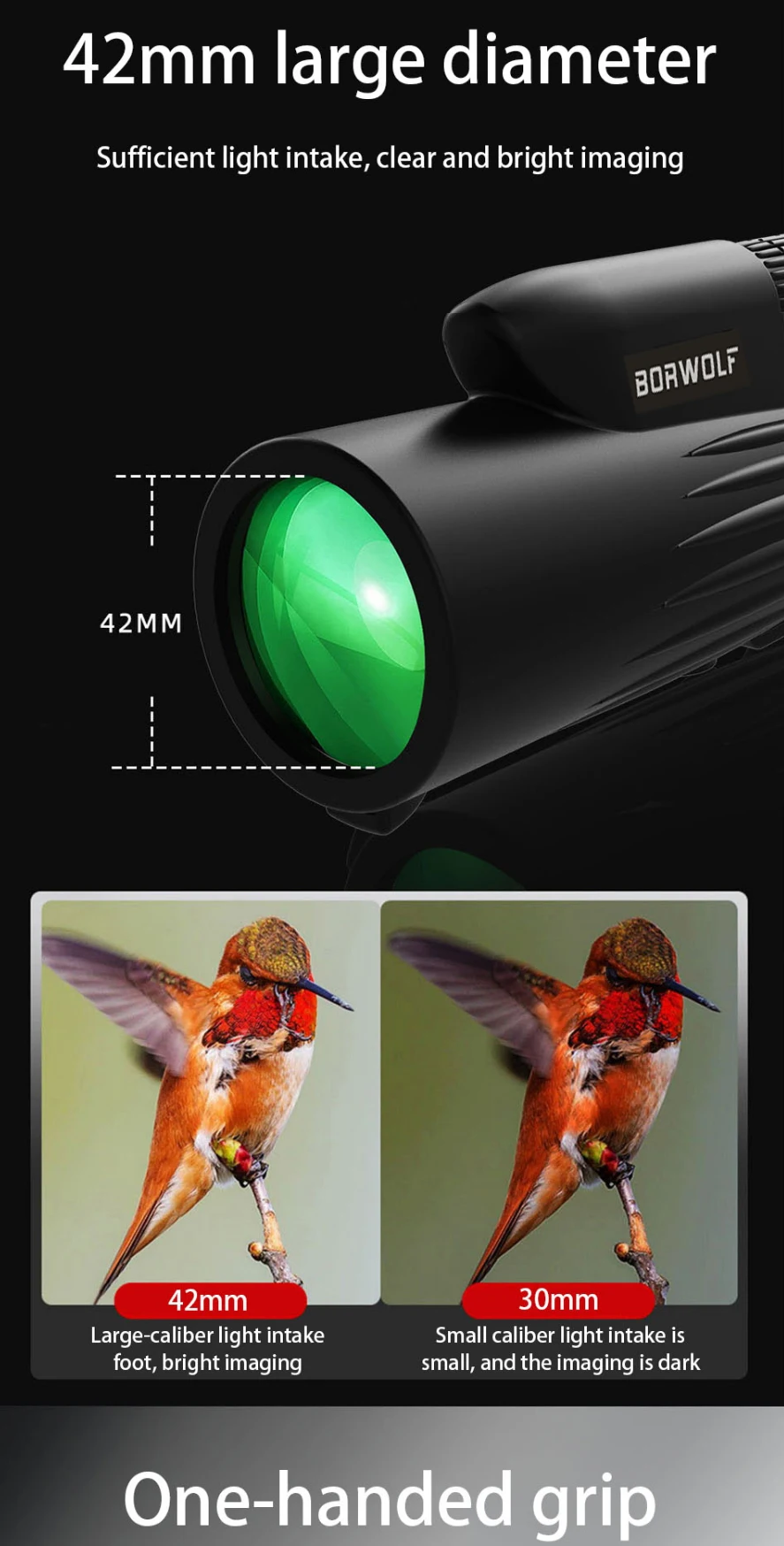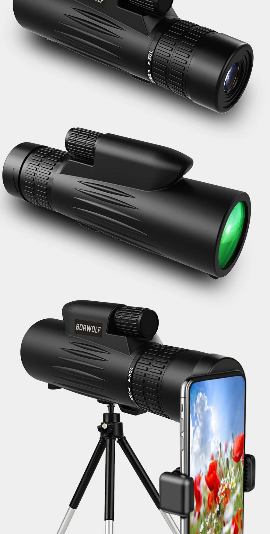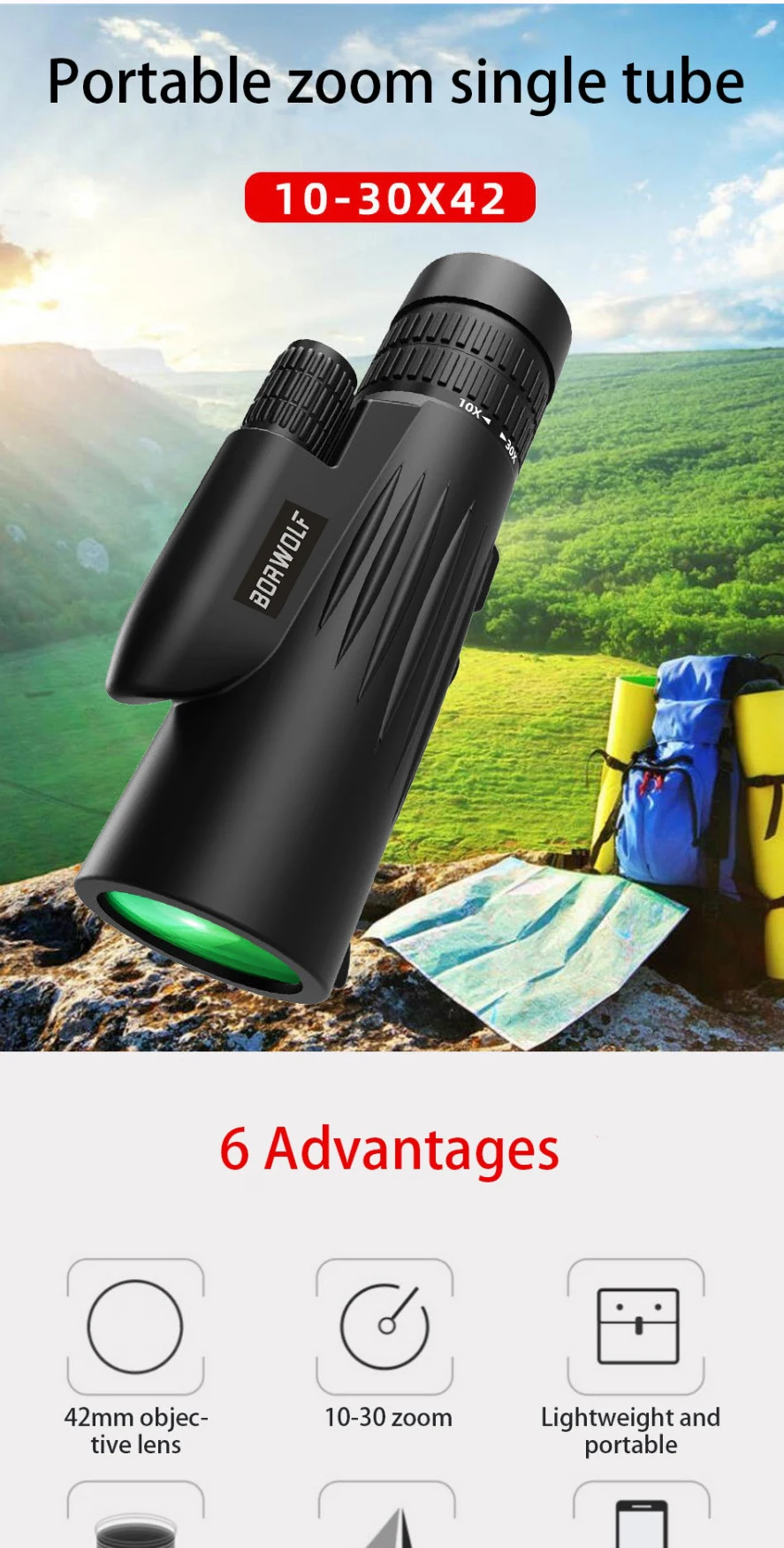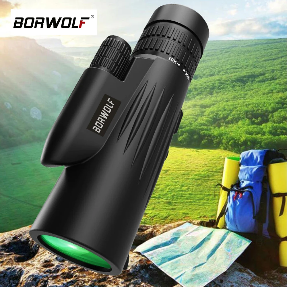 Borwolf-telescopio Monocular Bak4 con Clip para teléfono, binoculares impermeables para caza, waving de aves, 10-30x42