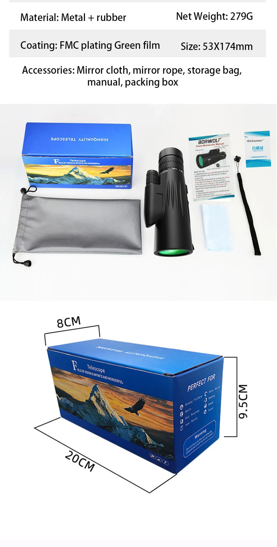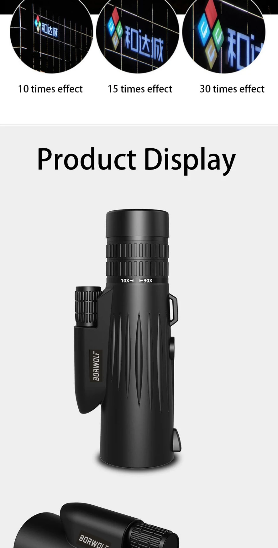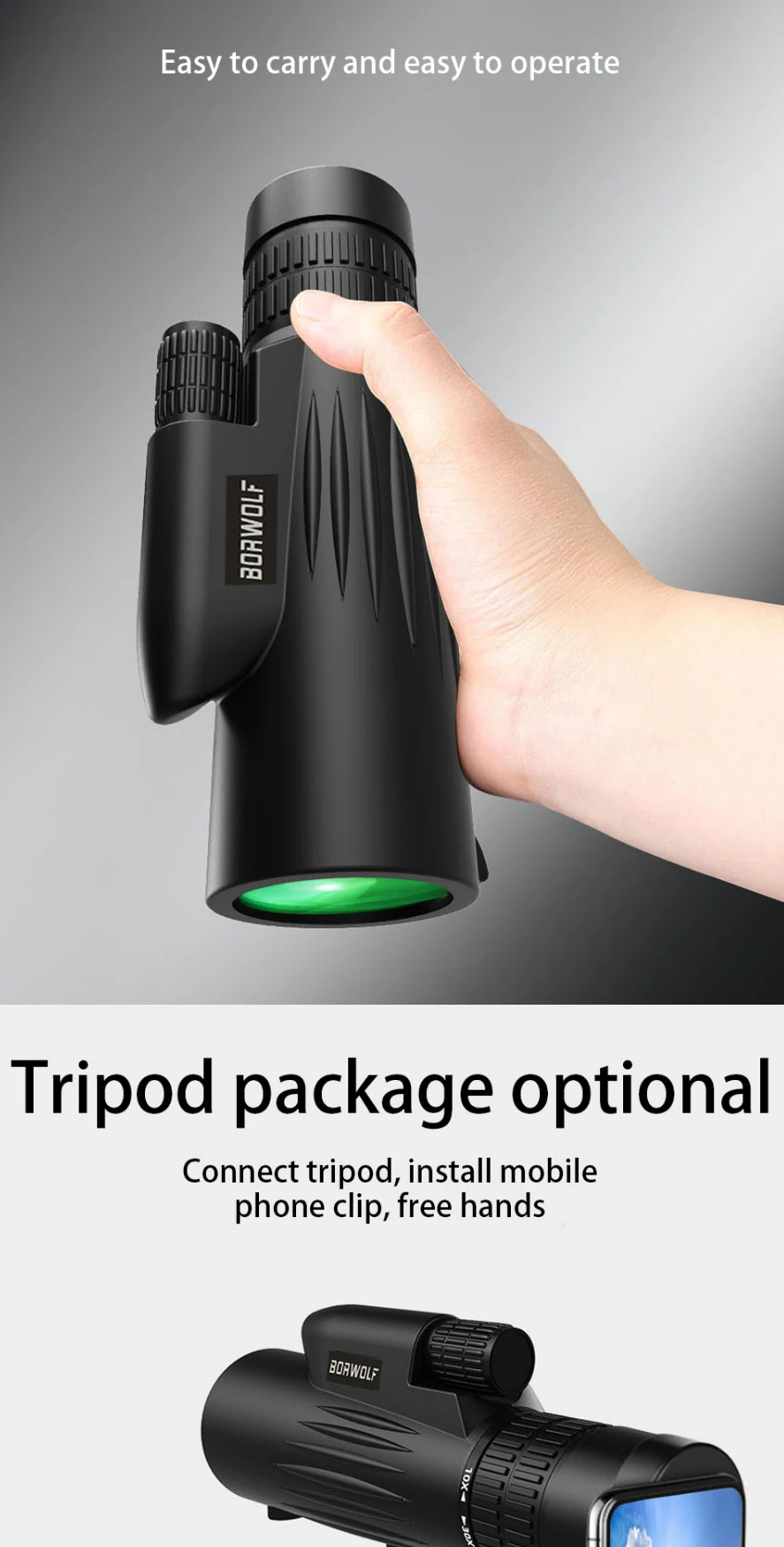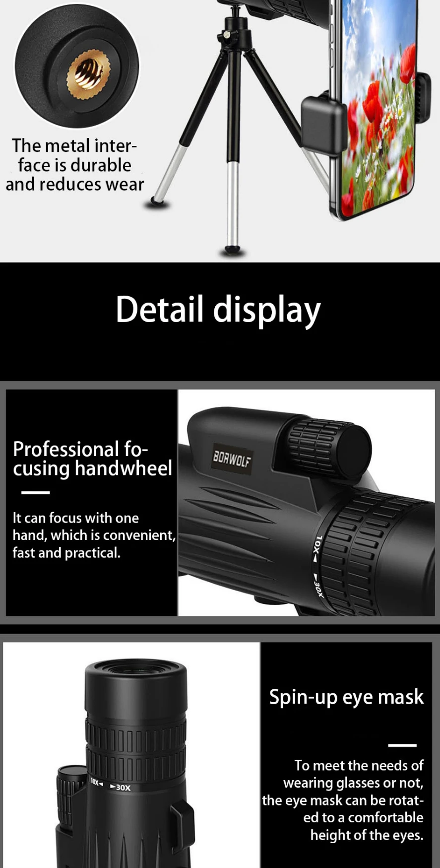 Borwolf-telescopio Monocular Bak4 con Clip para teléfono, binoculares impermeables para caza, waving de aves, 10-30x42