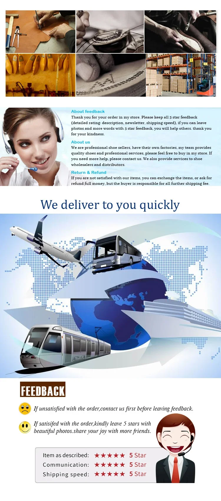 Gracias por tu pedido en mi tienda.Conserve todos los comentarios de 5 estrellas (calificación detallada: descripción, boletín informativo, velocidad de envío), si puede dejar fotos y más palabras con comentarios de 5 estrellas, ayudará a otros.Gracias por su amabilidad.Sobre nosotrosSomos vendedores de calzado profesionales, tenemos sus propias fábricas, mi equipo ofrece zapatos de calidad y servicios profesionales, no dude en comprar en mi tienda. Si necesita más ayuda, por favor contáctenos. También brindamos servicios a mayoristas y distribuidores de calzado.