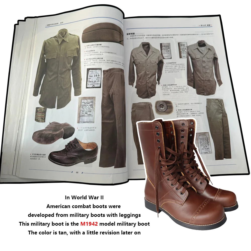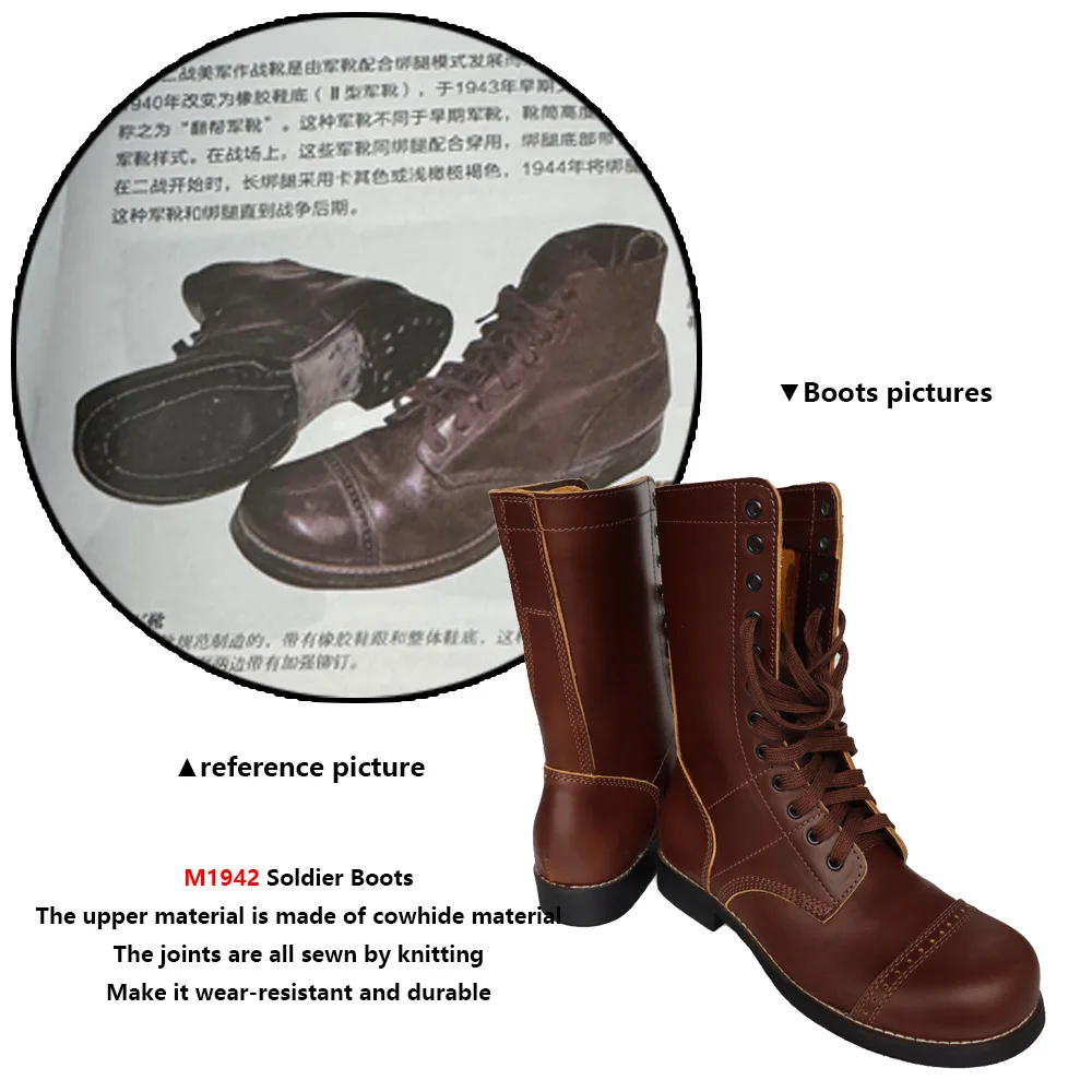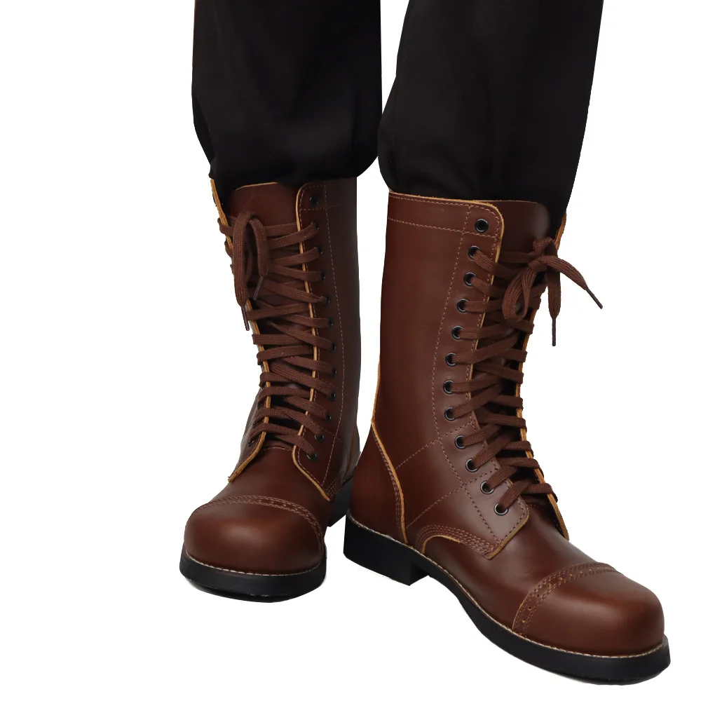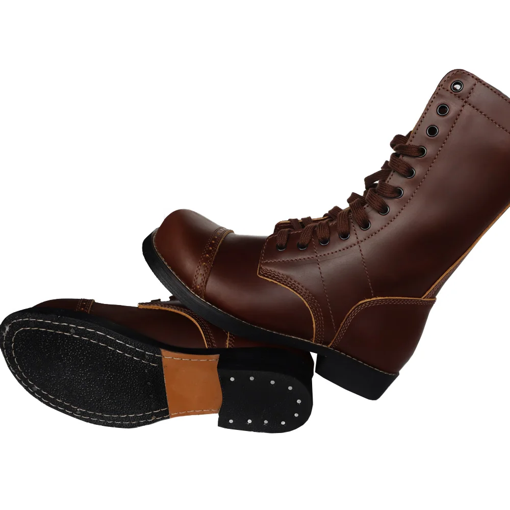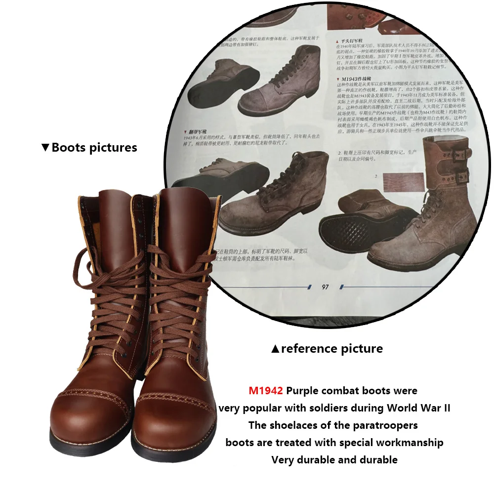 Estos zapatos son botas de paracaidistas retro de la Segunda Guerra Mundial, violetas y oscuras, con muchas suturas cifradas en la parte superior, que pueden garantizar que todo el zapato no se destruya fácilmente.Hay suelas de goma gruesas en la parte inferior de los zapatos, lo que garantiza que los zapatos sean resistentes al desgaste y aumenta la comodidad de los zapatos.Los zapatos son botas rectas que se pueden usar con pantalones sueltos o ajustados.Todo el empeine está hecho de piel de vaca, fuerte y resistente al desgaste, hermosa y hermosa.