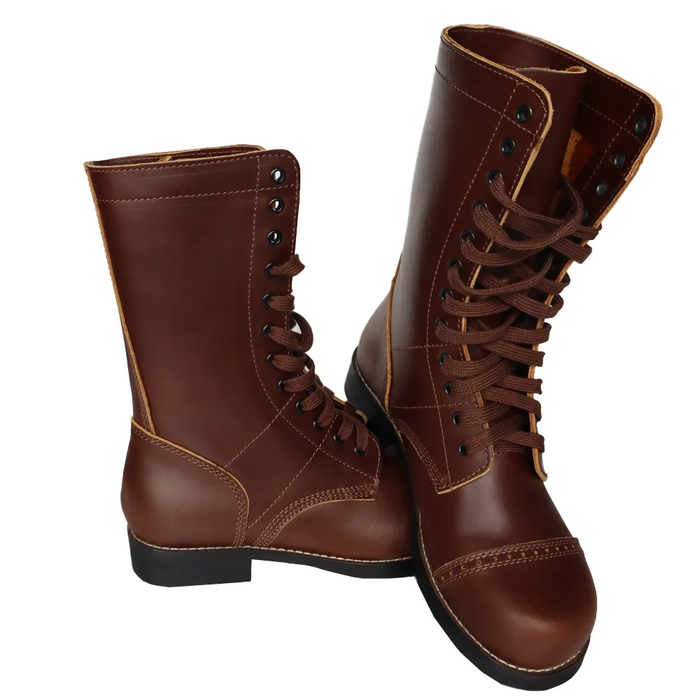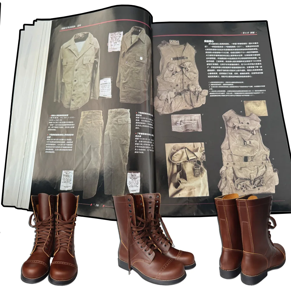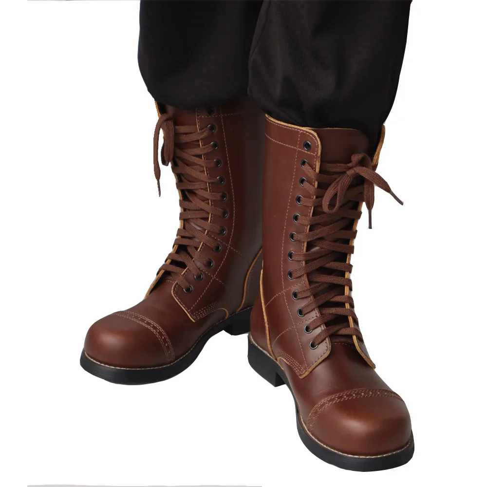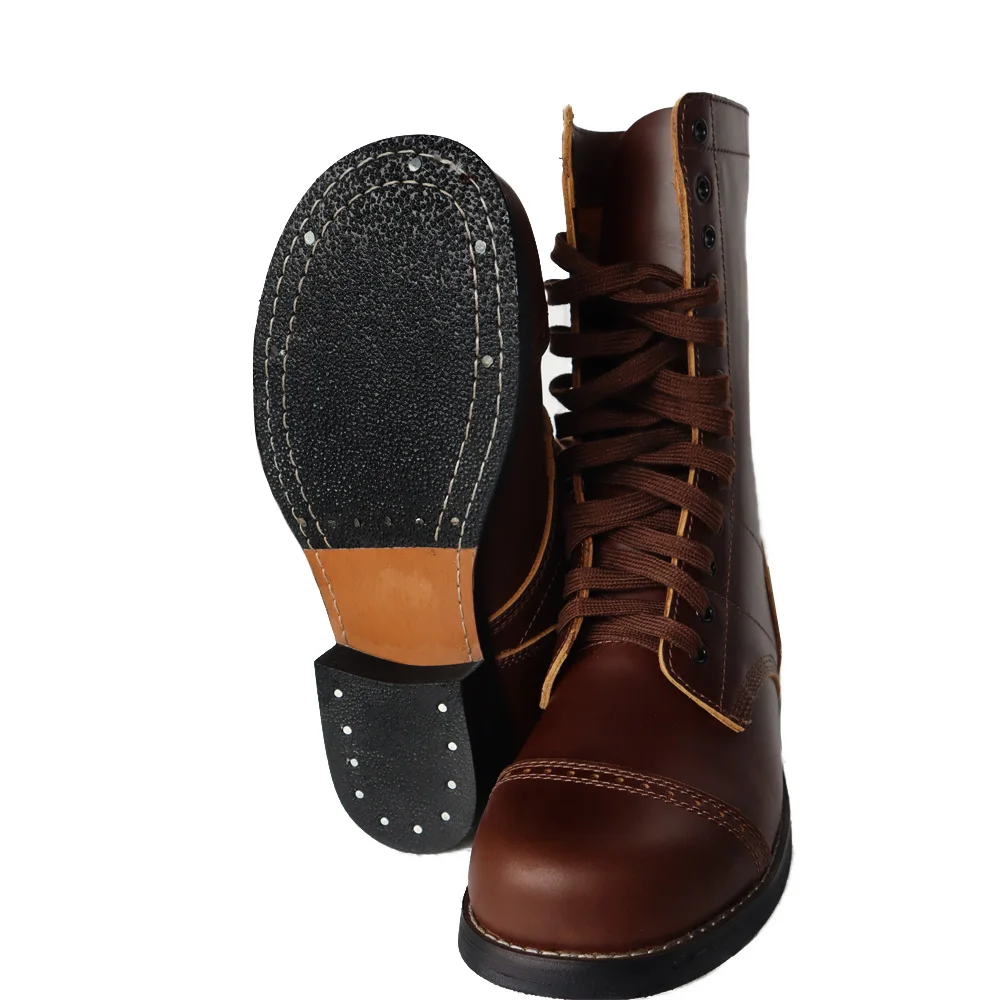 Estos zapatos son botas de paracaidistas retro de la Segunda Guerra Mundial, violetas y oscuras, con muchas suturas cifradas en la parte superior, que pueden garantizar que todo el zapato no se destruya fácilmente.Hay suelas de goma gruesas en la parte inferior de los zapatos, lo que garantiza que los zapatos sean resistentes al desgaste y aumenta la comodidad de los zapatos.Los zapatos son botas rectas que se pueden usar con pantalones sueltos o ajustados.Todo el empeine está hecho de piel de vaca, fuerte y resistente al desgaste, hermosa y hermosa.