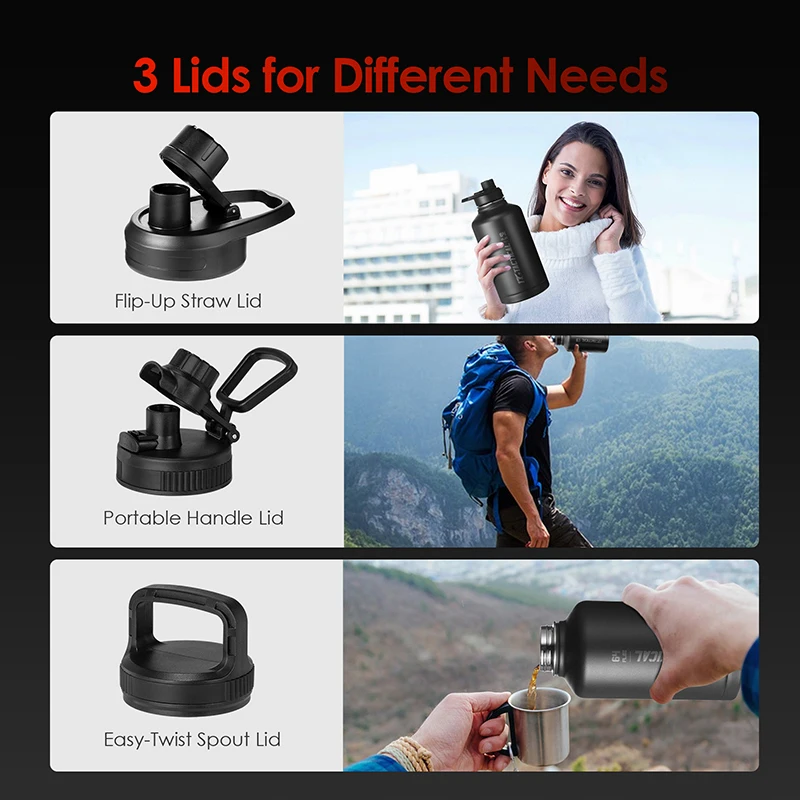【3 tapas intercambiables】Nuestro matraz de agua viene con 3 tapas diferentes, cada una diseñada para diversos escenarios de estilo de vida y preferencias de bebidas.Este cuidadoso diseño brinda a los usuarios gran comodidad y flexibilidad.Ya sea para el uso diario, para sorbos rápidos o para saborear su bebida, nuestra botella de agua satisface sin esfuerzo sus necesidades.