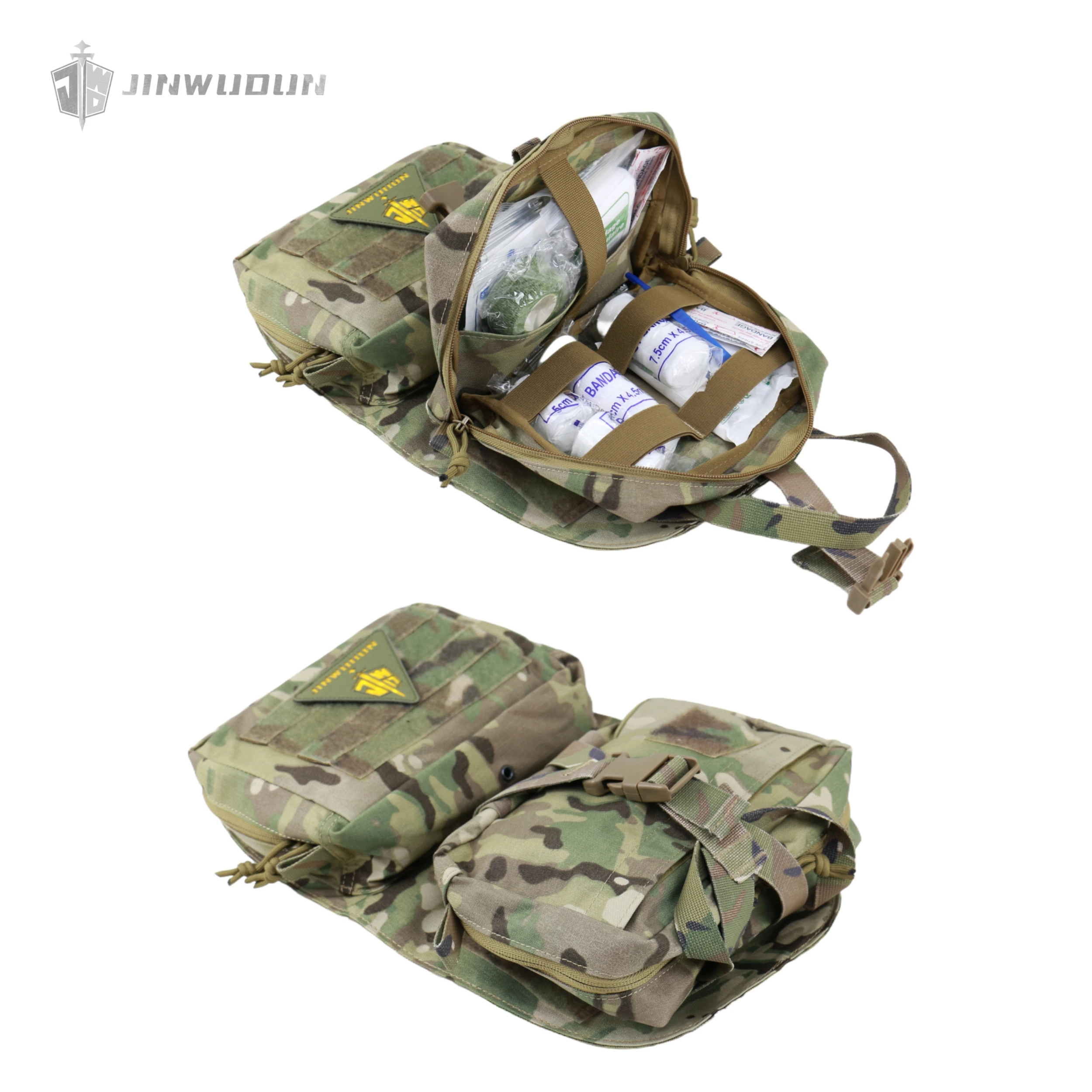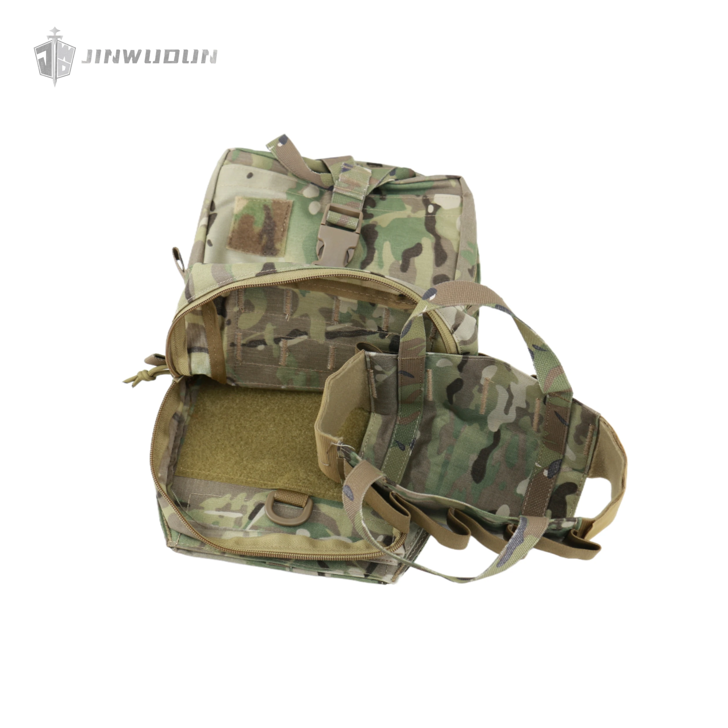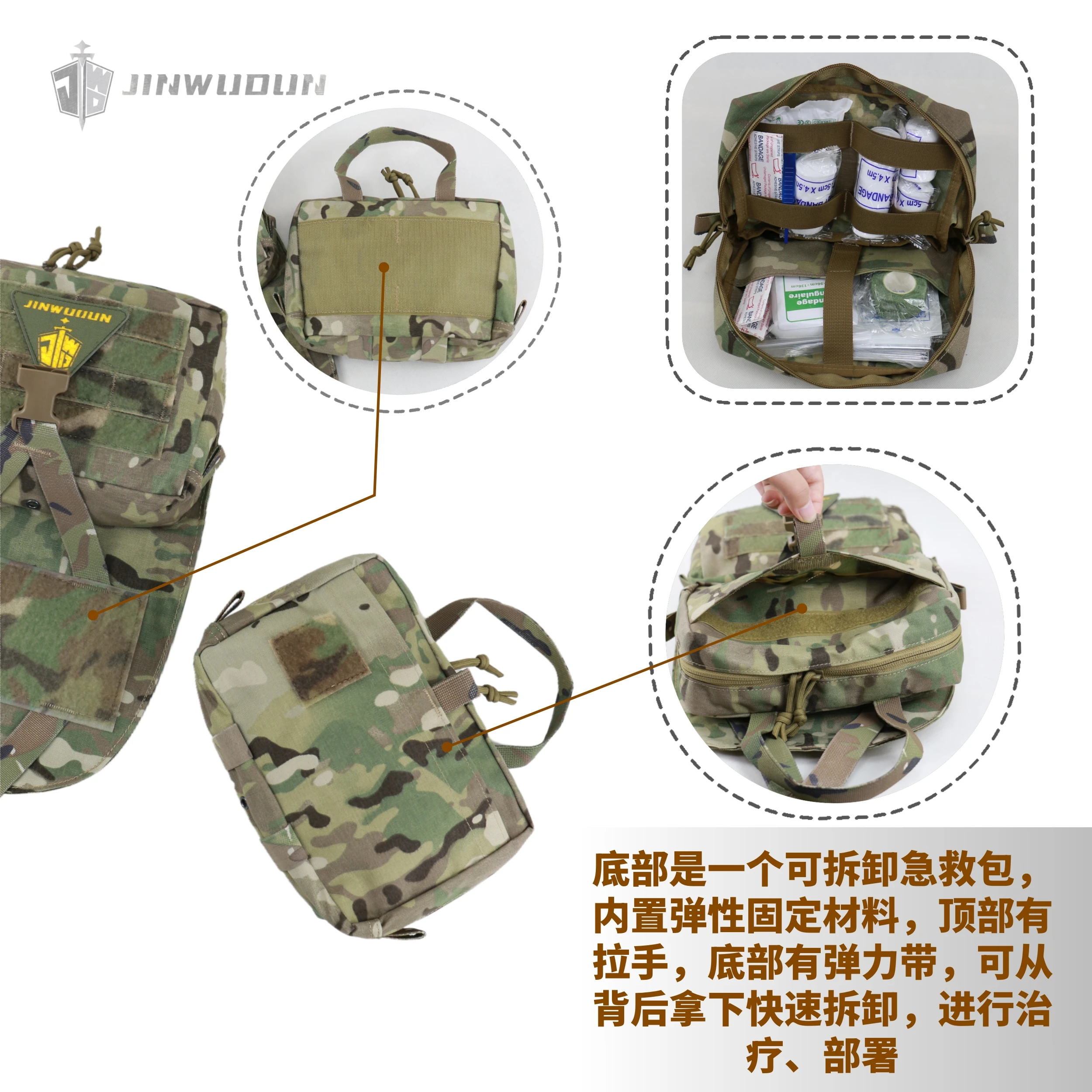 Presenta un diseño de doble zona: la parte superior está equipada con una bolsa funcional desmontable que puede contener 8 artículos de 40 mm y admite un desmontaje rápido;la parte inferior es una bolsa de emergencia desmontable con materiales de fijación elásticos incorporados, que cuenta con un asa y bandas elásticas, que se pueden quitar rápidamente de la parte posterior para tratamiento y despliegue de emergencia.