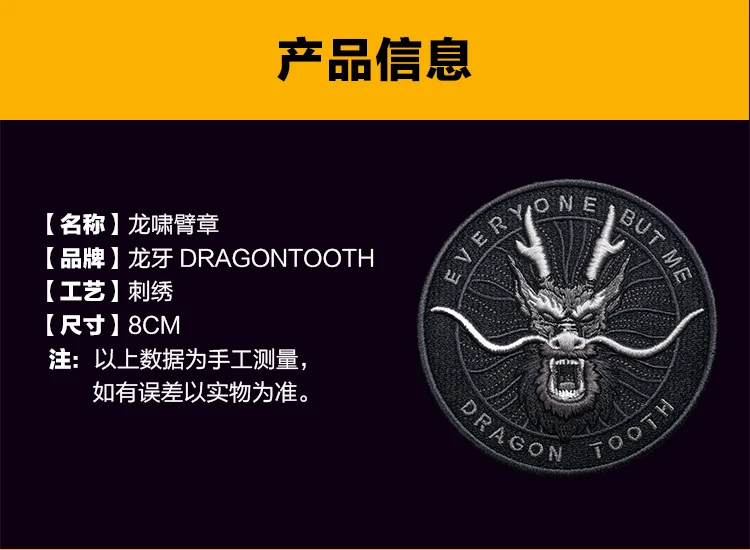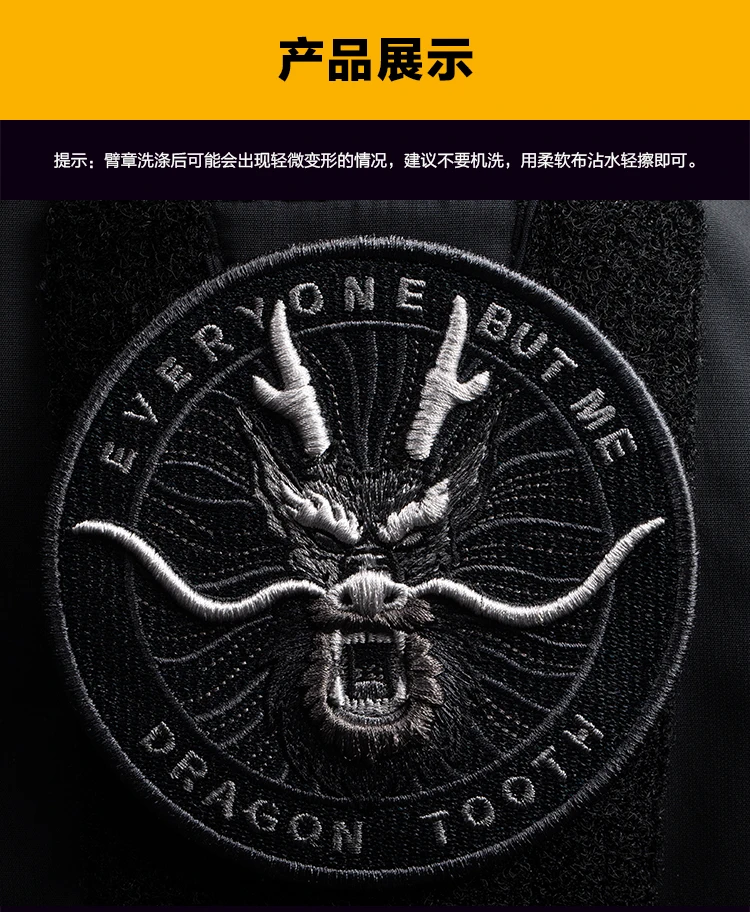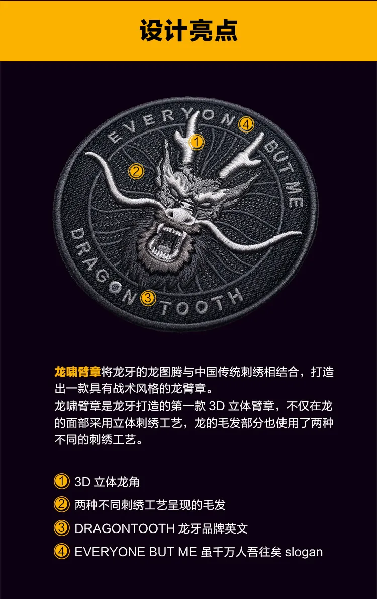El brazalete Dragon Roar combina el tótem de dragón del diente de dragón con el bordado tradicional chino para crear un brazalete táctico de dragón.El brazalete Dragon Xiao es el primer brazalete 3D creado por Dragon Teeth. No solo utiliza bordado 3D en la cara del dragón, sino que también utiliza dos técnicas de bordado diferentes en el pelo del dragón.